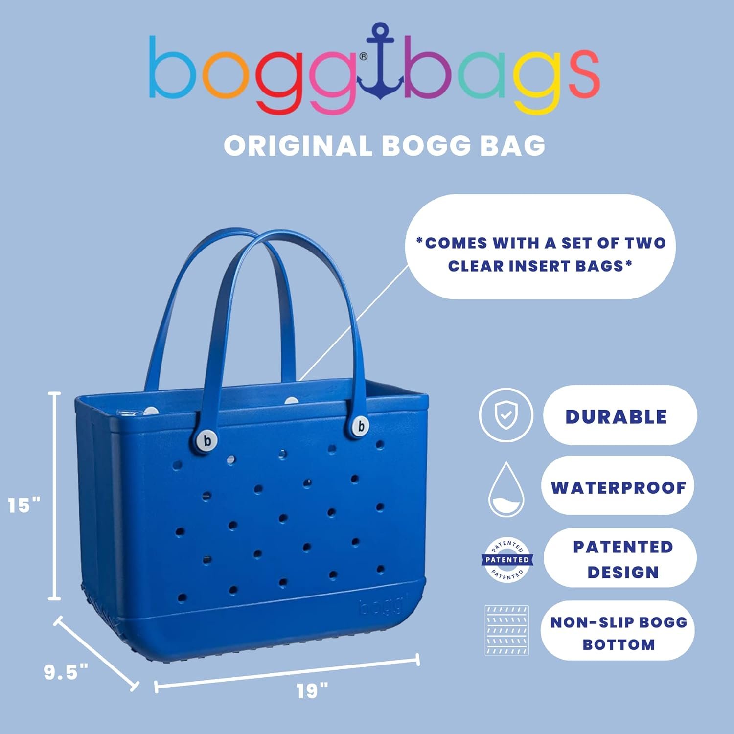 This original Bogg Bag is our largest tote, stylish enough for a girl’s weekend and large enough for family day at the beach.Take the Bogg Bag along for all your adventures. Style Number: 26OB-TQ Designed not to bring home sand Easy washable Measures 19x15x9.5 Comes with a set of two clear insert bags, one large and one small Large insert measures 9.5 inches high, 11.25 inches wide Small insert measures 5 inches high, 7 inches wide
