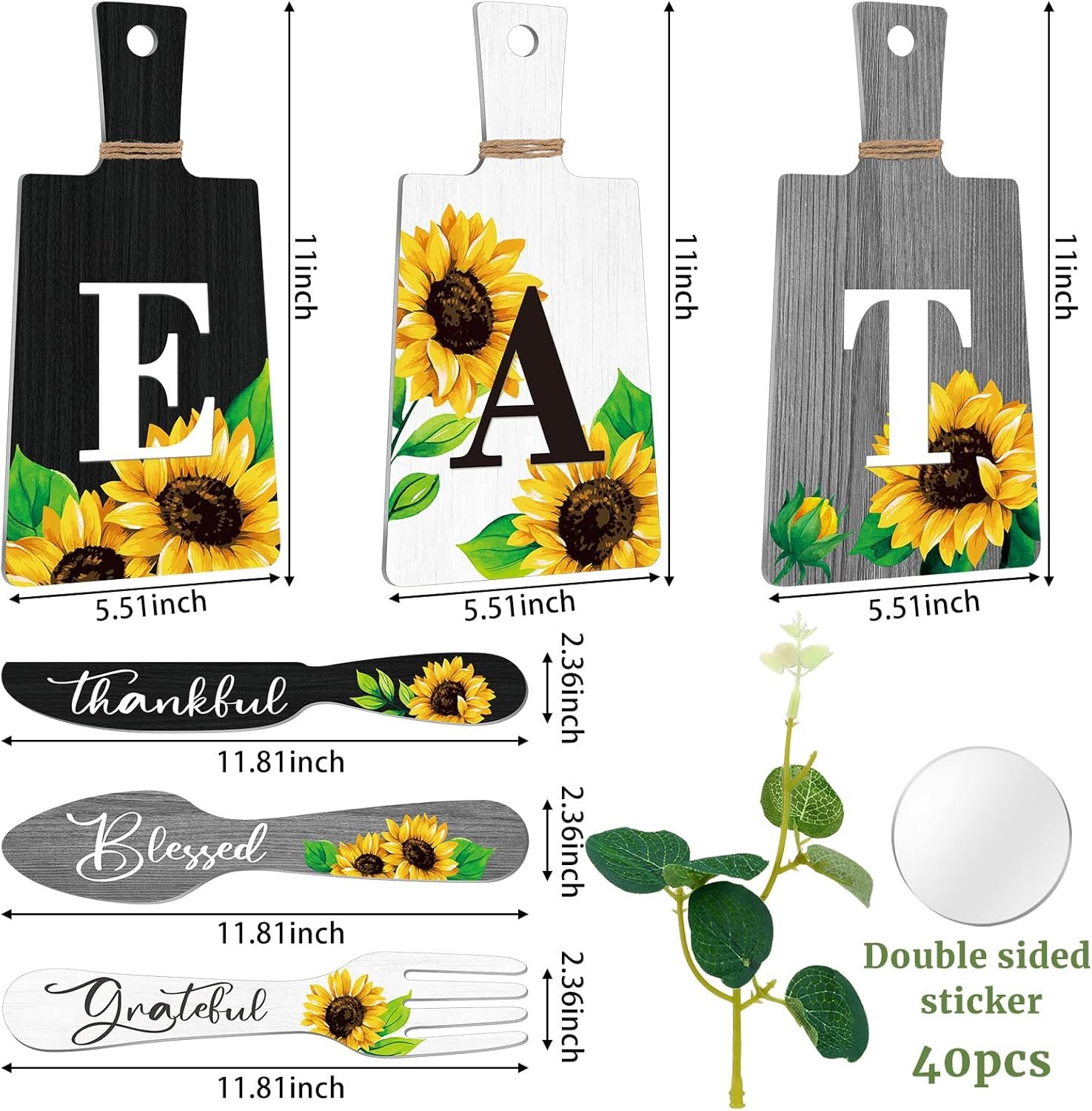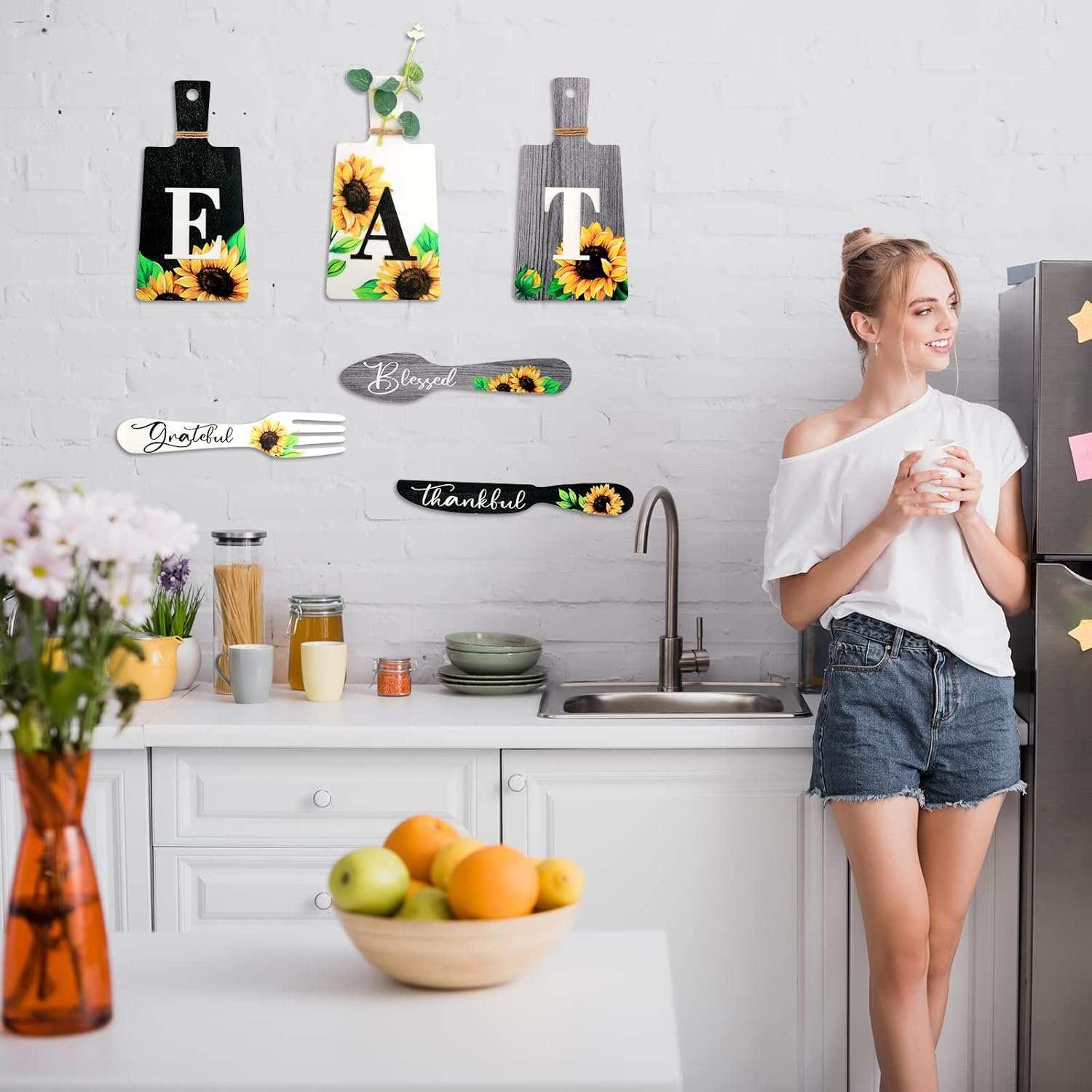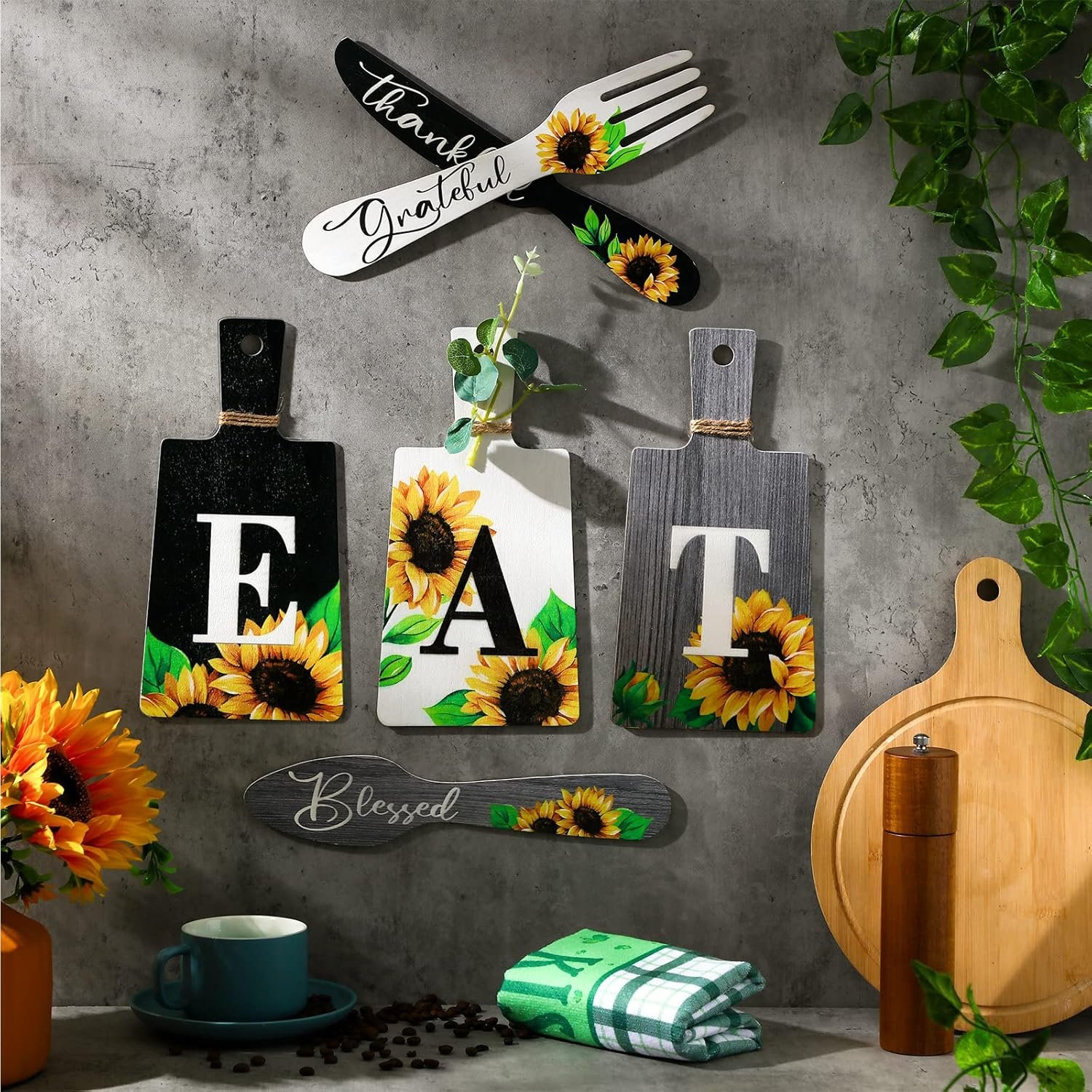 Bucherry Set of 6 Sunflower Kitchen Decor Sets Eat Signs Fork and Spoon Wooden Kitchen Wall Decor Hanging Plaques Farmhouse Sunflower Kitchen Decor and Accessories(Black, White, Gray)