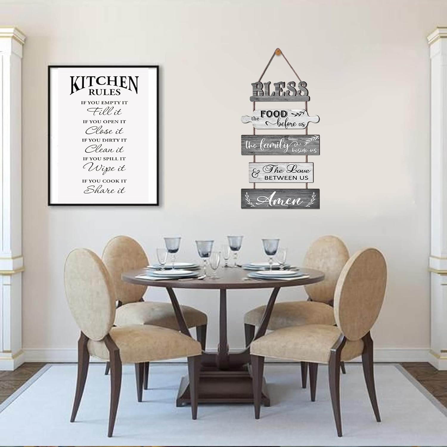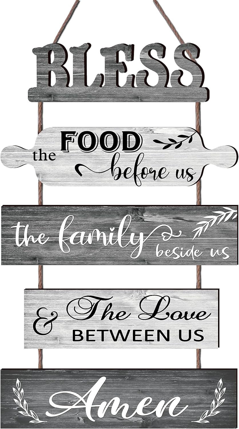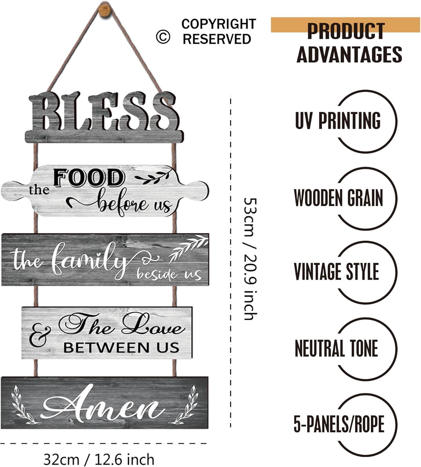 FARMHOUSE KITCHEN DECOR: Consists of 5 piece cut out collage plaques with pop saying: bless the food before us, the family beside us, and the love between us, amen. Remember daily prayer before meal,very devoutly thank God for the food,cherish food and love each other. Distressed and aged grain wood, rustic looking for your dining room, kitchen. Printed with positive & lovely words.