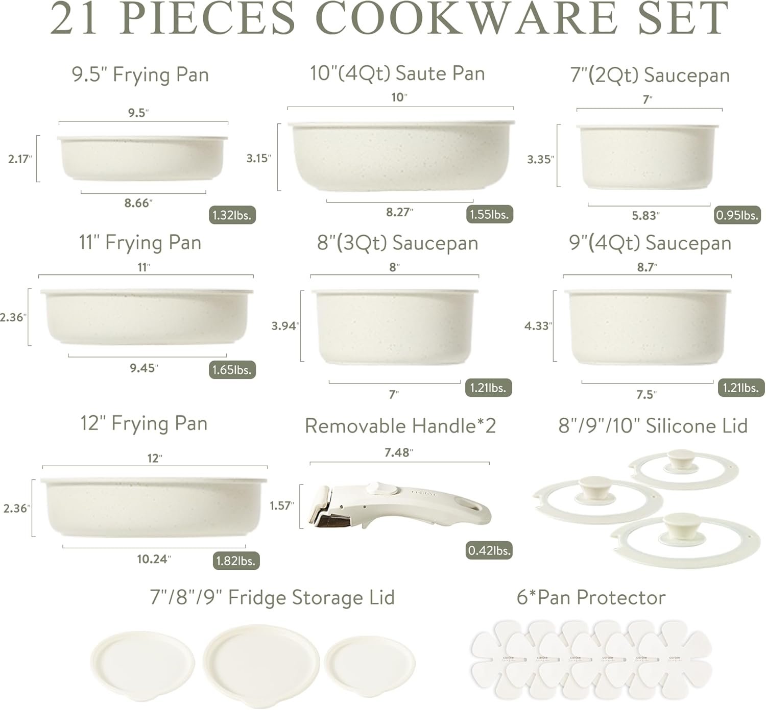 CAROTE 21pcs Pots and Pan Set Non Stick, Nonstick Induction Cookware, Cookware Set Kitchen with Detachable Handle, Removable Handle Cookware, RV Oven Safe Cookware, Cream White