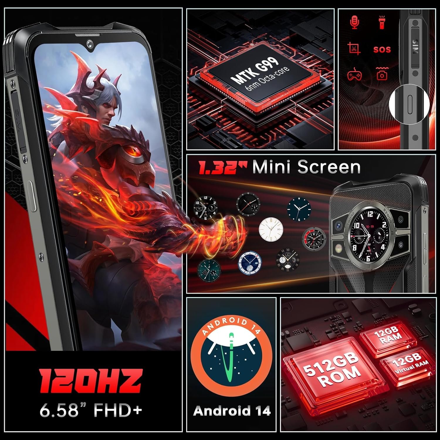 6.58-Inch FHD+ 120Hz Display : CUBOT Kingkong 9 waterproof phone comes with a 6.58″ FHD+ display, with superb 1080*2408 resolution, 450nits brightness deliver incredible clarity and vivid visuals. Featuring a 120Hz adaptive refresh rate, it offers a supremely smooth daily user experience, ensuring smoother scrolling of web pages and animations in apps, and 2.4K display enhances clarity and expands the color gamut for exceptional video detail. The CUBOT kingkong 9 Android phones is equipped Personalize your device with the Custom Cover Screen and display useful information like time, music player, compass, and more…
