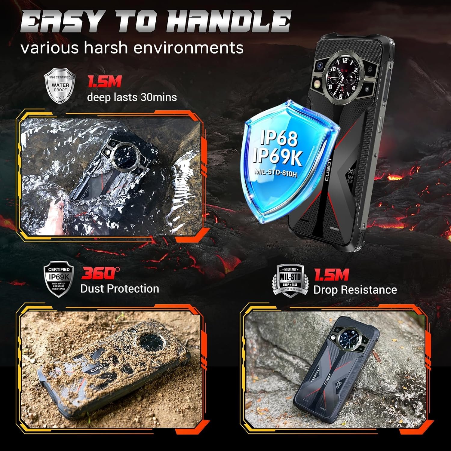 IP68/IP69K & MIL-STD-810H : With its IP68/IP69K dust and waterproof rating and MIL-STD-810H certification, the CUBOT King Kong 9 rugged mobile phone can withstand extreme temperatures and conditions without compromising its functionality.The CUBOT KingKong 9 cell phone can accompany you on outdoor activities such as hiking, scuba diving or camping, and keep you safe from the elements under any harsh conditions. The indestructible phone can withstand the elements under any adverse conditions.