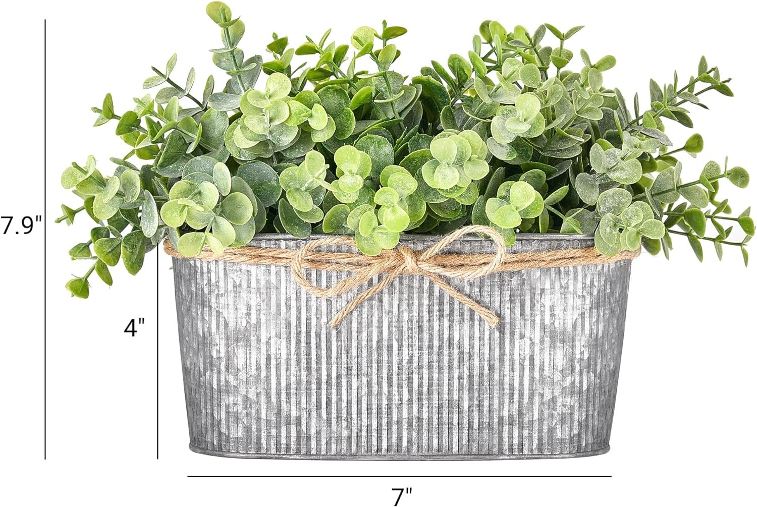 Farmhouse Home Decor Size: Rectangular metal pots: 7″L x 4″H Material: Plastic artificial plants, metal pots. Included: Eucalyptus plant x 3 Rectangular pot x 1 Crossed pearl cotton x 1 Instruction manual x 1