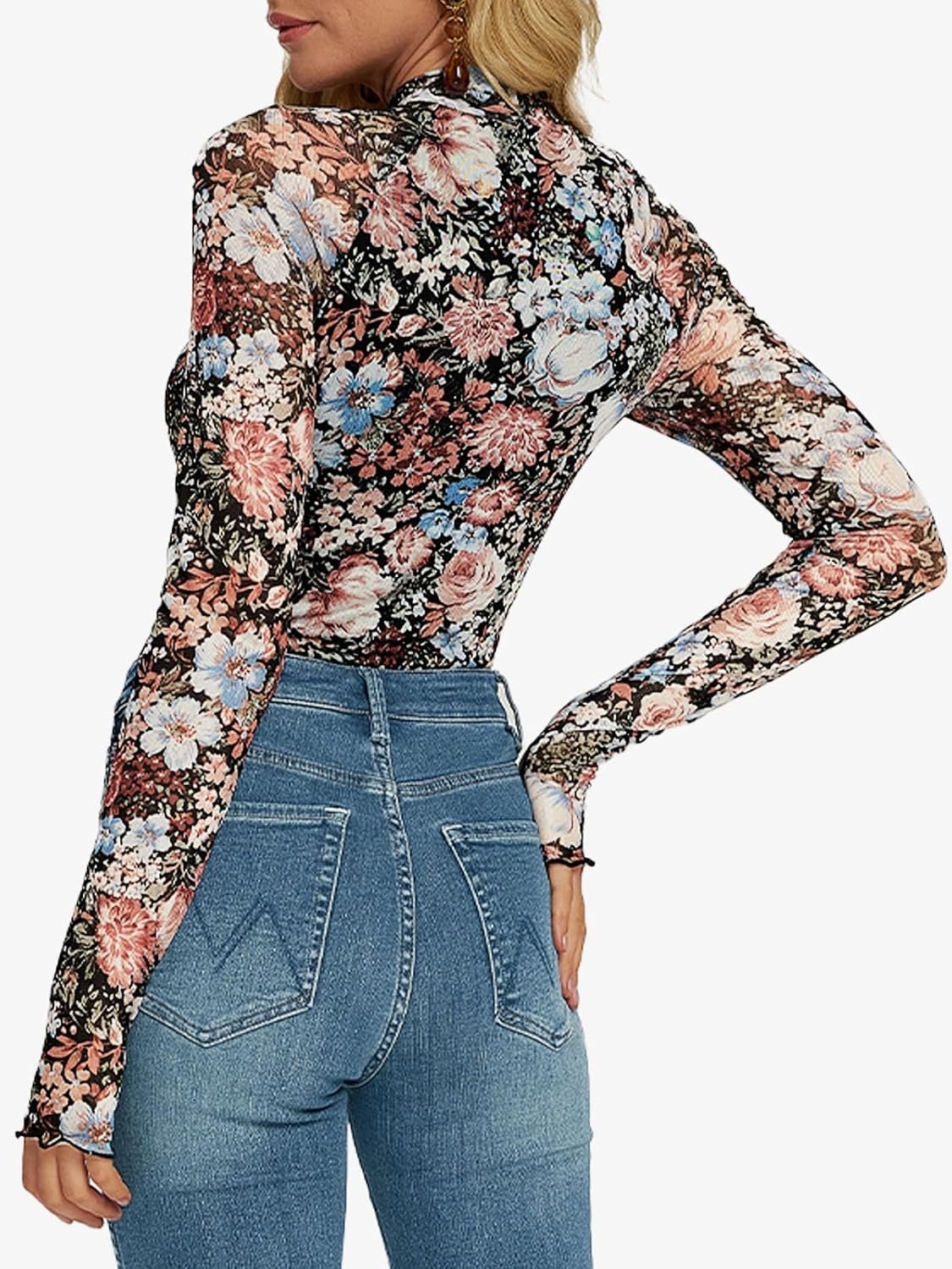 Dealmore Floral Mesh Mockneck Tops Trendy Going Out Tops fot Women with Thumb Hole Fashion Fall Outfits 2024