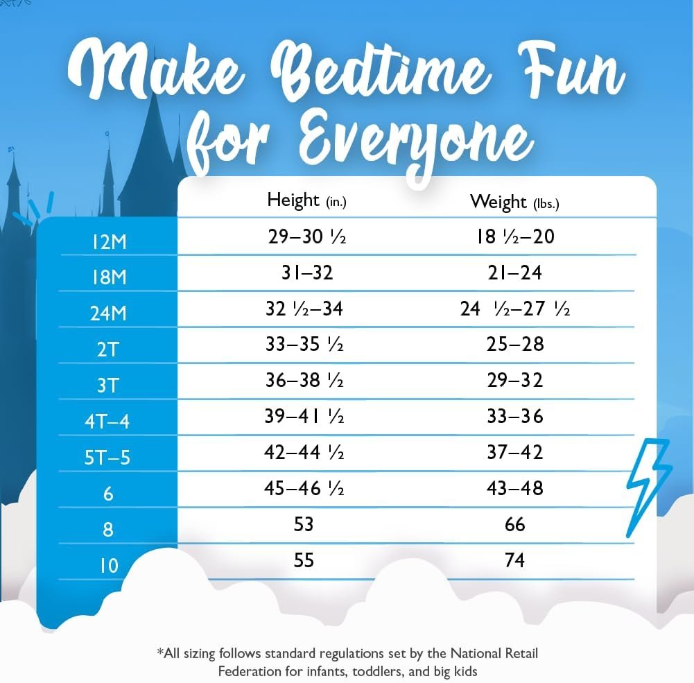 Princess Rapunzel dancing next to a size chart of the Disney princess sleepwear.Princess Rapunzel dancing next to a size chart of the Disney princess sleepwear.