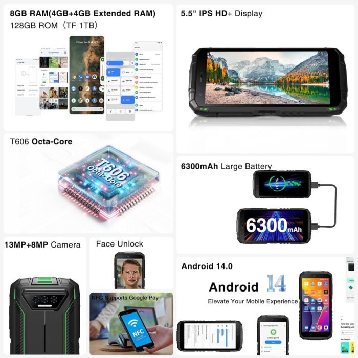 DOOGEE S41 Plus Rugged Smartphone 2024,6300mAh Battery,8GB+128GB/TF 1TB,Android 14 Smartphone,Octa Core,IP68 Waterproof Phone,13MP AI Main Camera Rugged Phone,5.5″ IPS HD+ Display,Face Unlock,OTG/NFC