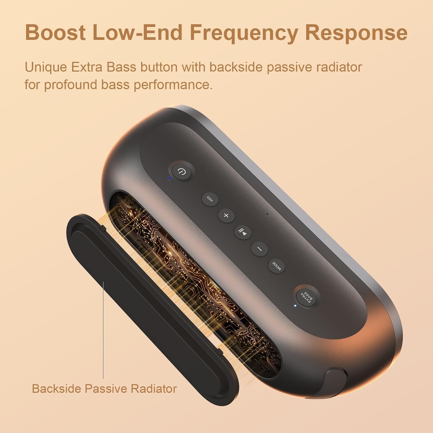 Punchy Bass: This innovative design features a backside passive radiator, maximizing the speaker’s surface area to boost sound pressure for deeper, richer bass with minimal distortion. Just press the Extra Bass button to enhance low-end frequencies, elevating your music experience to new heights.