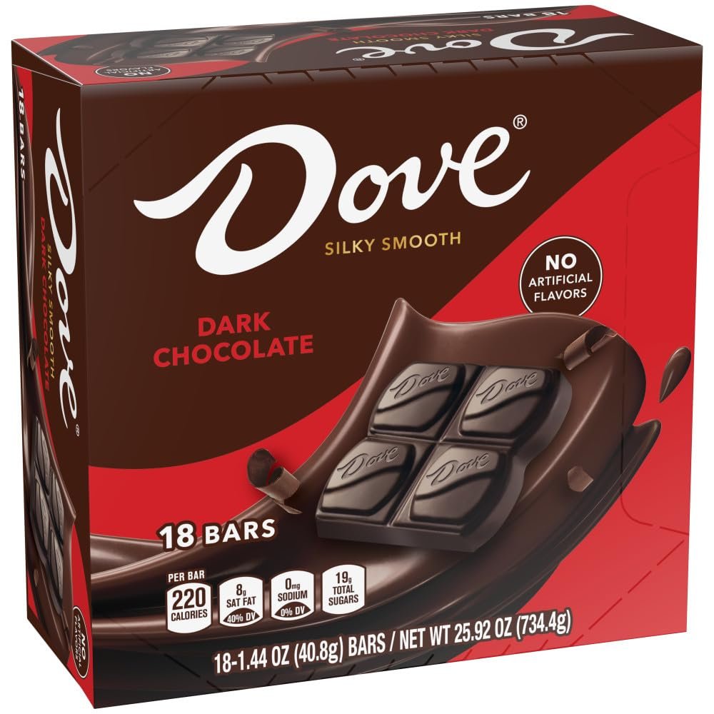 Contains eighteen (18) 1.44-ounce bars of DOVE Dark Chocolate