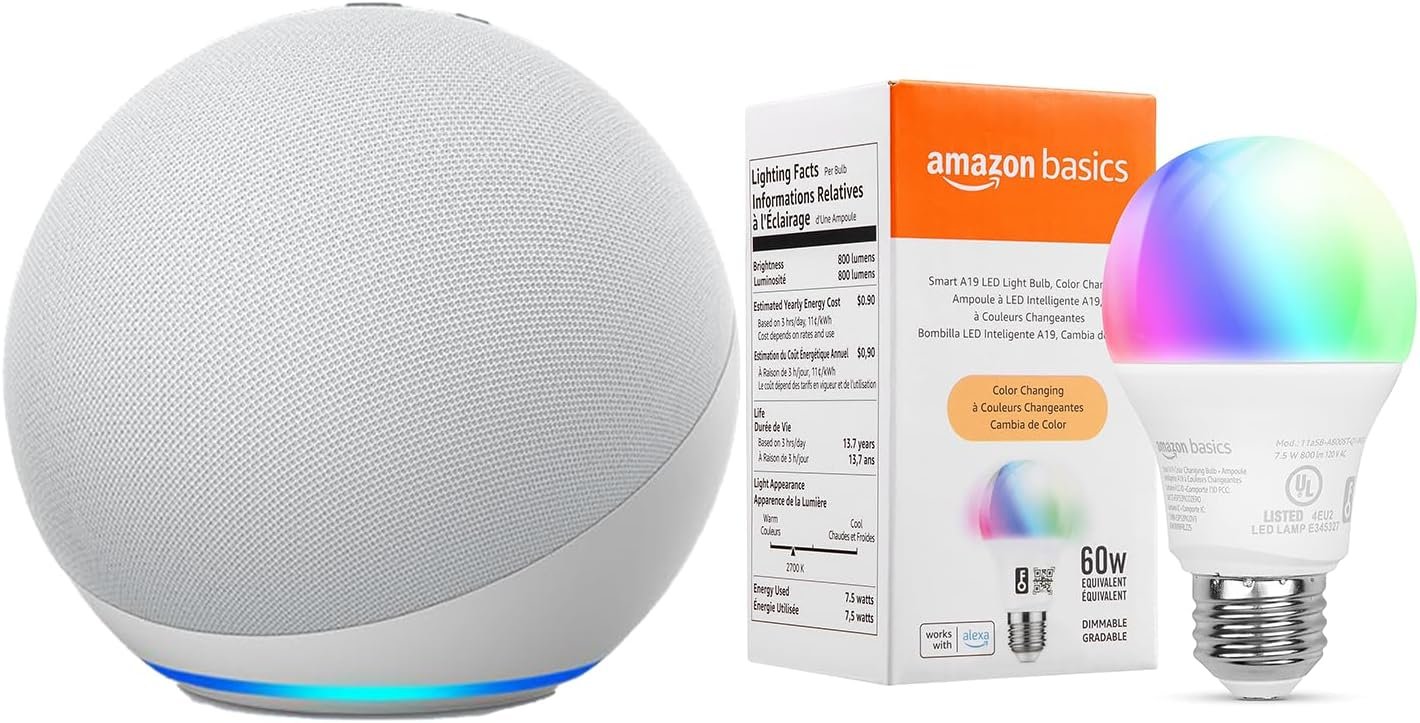 This bundle includes an Echo (4th Gen) in Glacier White and an Amazon Basics Smart Color Bulb.