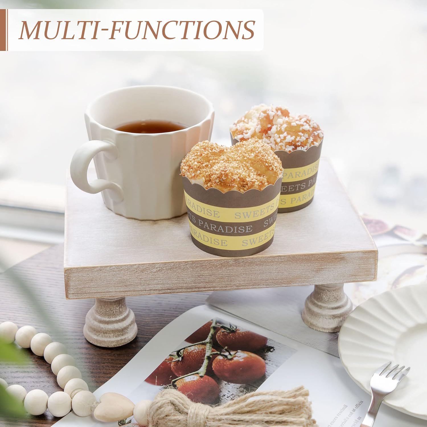 [ BRIGHTEN YOUR FARMHOUSE DECOR ] This wooden stand for dispaly has smooth surfaces and beautiful natural wood grain, making an rustic display tray for your home decor. Add natural style to your farmhouse kitchen, coffee table or bathroom counter decor.
