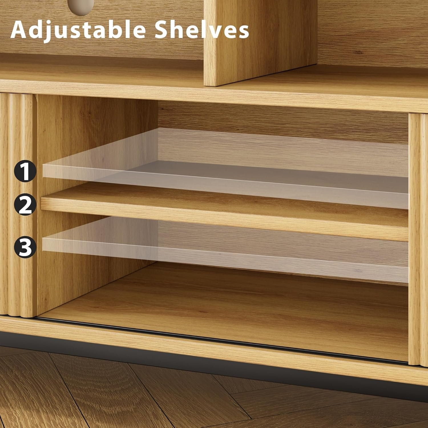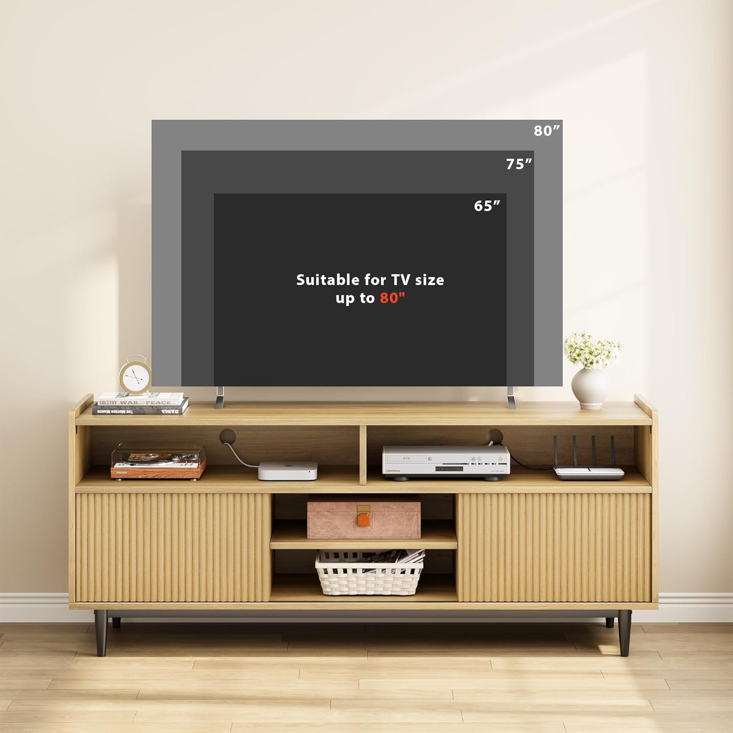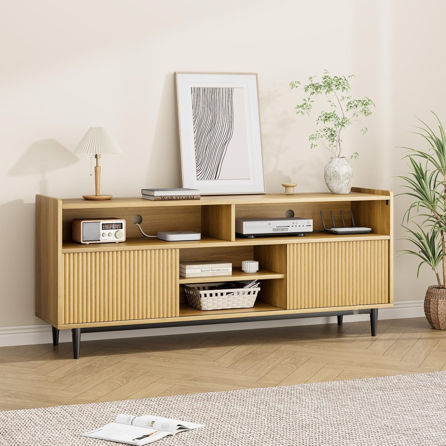 CHIC DESIGN: This TV stand beautifully combines a wooden entertainment center with fluted doors, showcasing a modern aesthetic. The media cabinet features a fluted sliding door design, characterized by clean lines and natural tones, allowing it to seamlessly integrate into your home and enhance various decorative styles