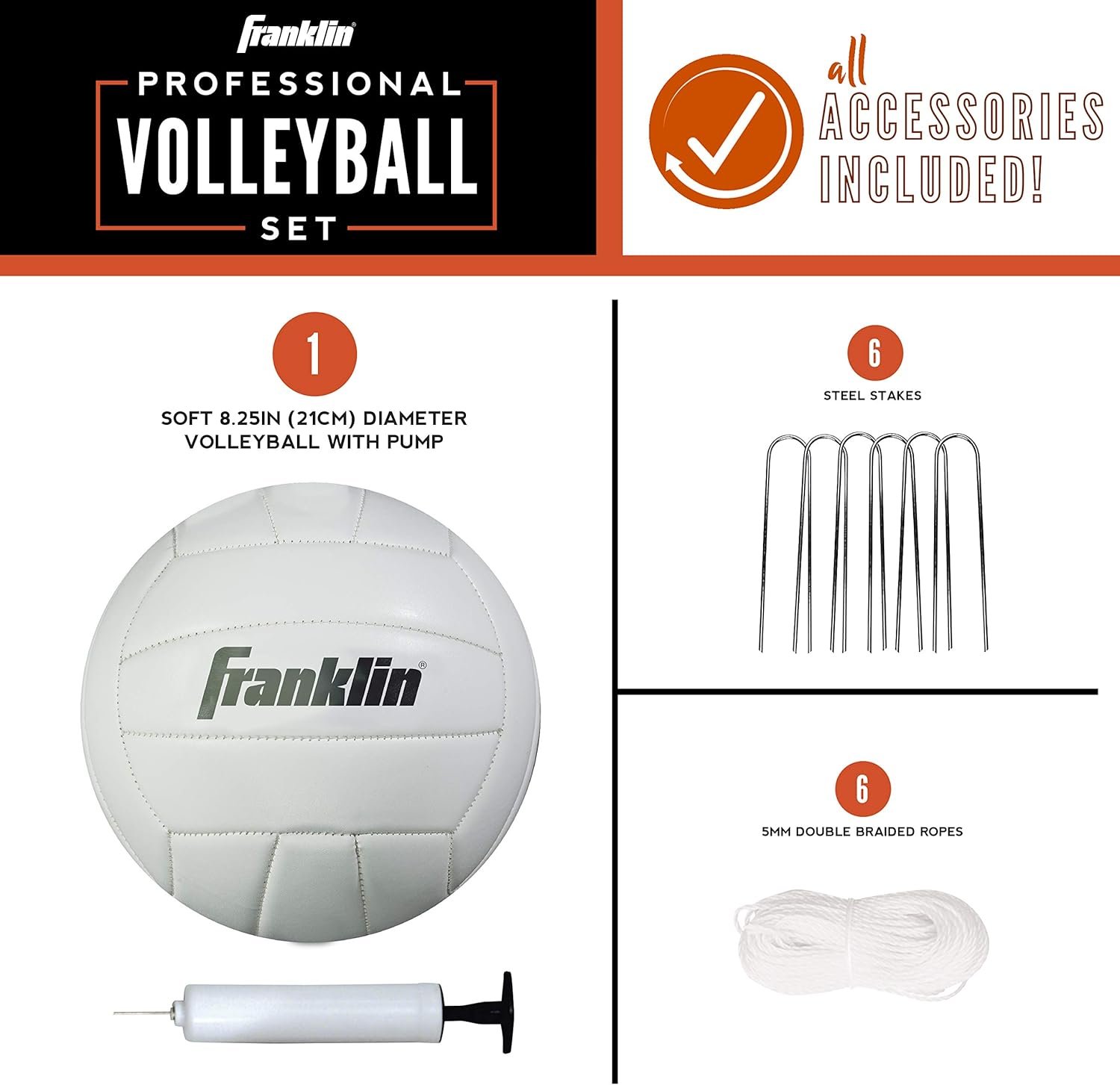 ACCESSORIES are all included: (1) synthetic rubber volleyball, (6) steel stakes, ropes and (1) inflating pump with needle, deluxe carry bag
