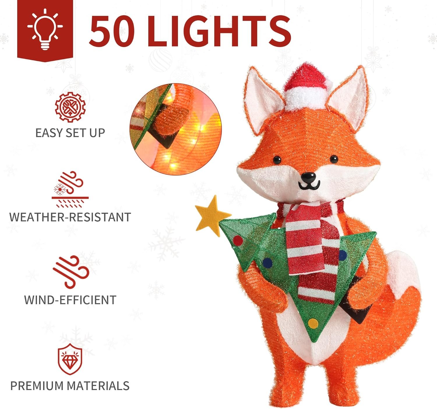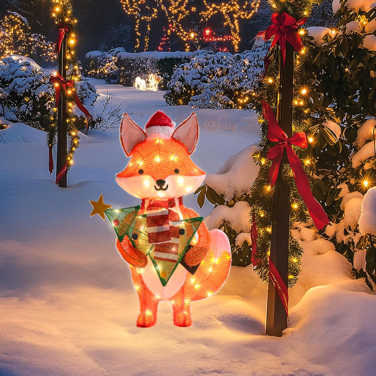 【EASY ASSEMBLY & ALL-WEATHER】This lighted fox christmas ornament is incredibly easy to set up and fold down when the holidays are over. Its compact design makes storage a breeze.Made from high-quality, weather-resistant materials, this fox is designed to withstand even the harshest winter conditions, ensuring it continues to look bright and beautiful all season long, no matter the elements.