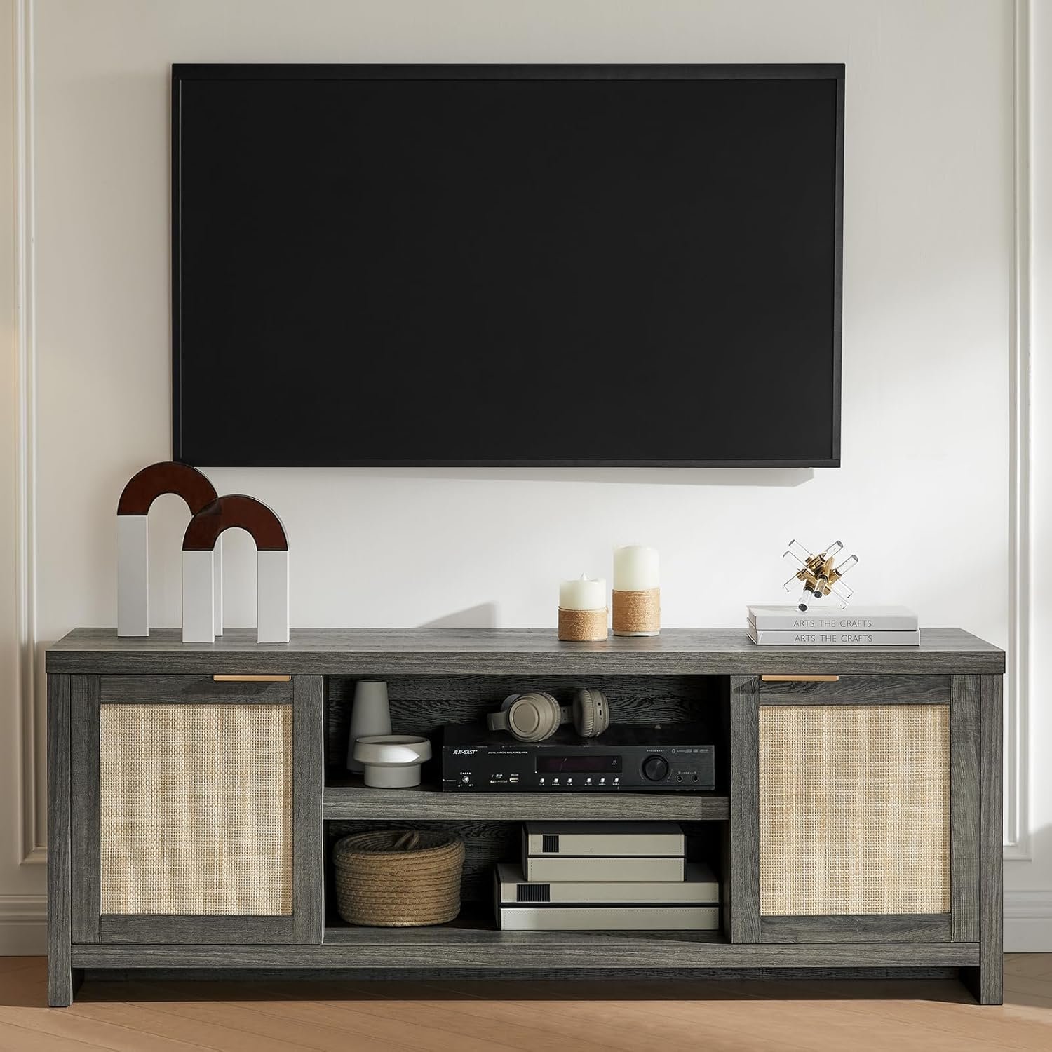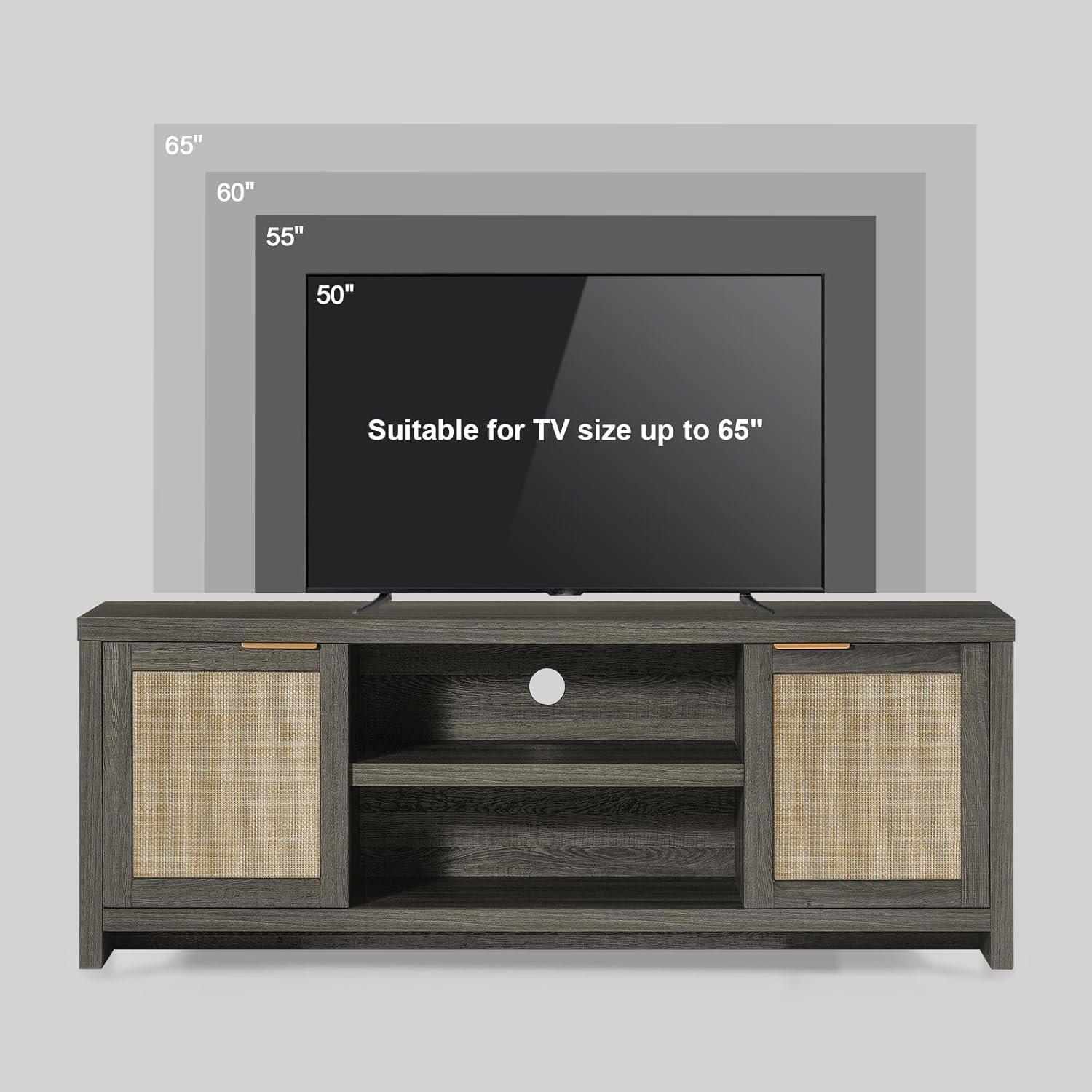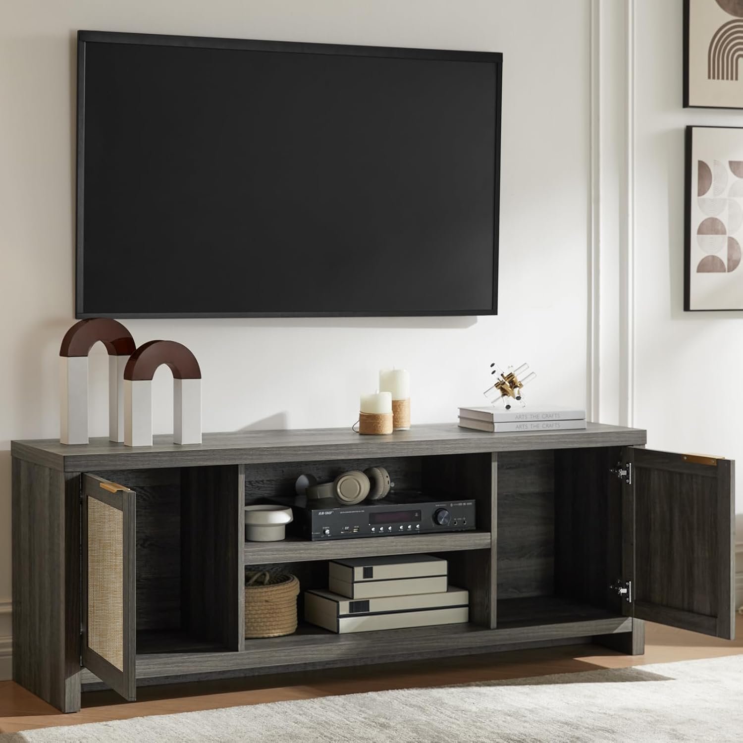 Tailored Fit for Large TVs: Measuring 59.1″L x 15.4″W x 21.7″H, this living room TV stand supports TVs from 50 to 68 inches. Designed as an ideal entertainment center for your living room, bedroom, or office, it features rattan-decorated doors that match the natural surface, providing ample space for your TV and room to showcase your beloved decorations.