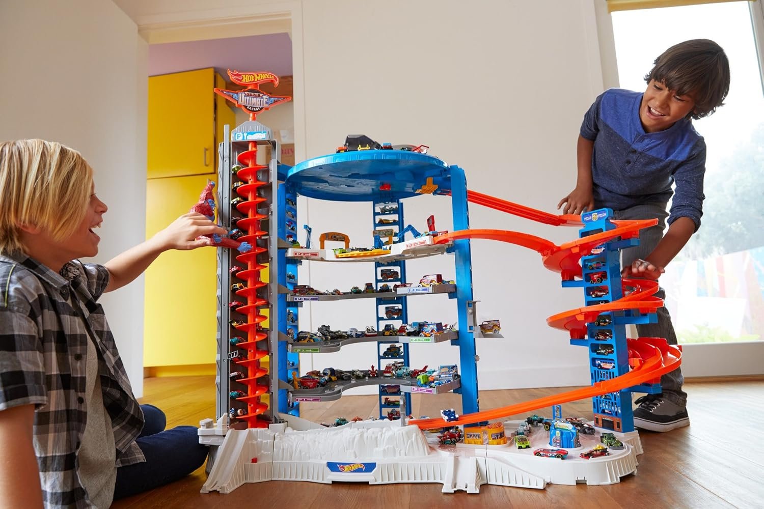 Explore the Hot Wheels Super Ultimate Garage for endless storytelling possibilities and opportunities for heroic, save-the-day moments! Standing over 3 feet tall and storing over 140 cars, this is the biggest Hot Wheels playset ever! Fuel your kid’s imagination exploring the different, exciting play zones, like the drive-up diner and car wash; the dynamic, moving parts, including a motorized elevator; a massive jet plane with a penthouse landing pad; and a menacing gorilla determined to swipe your cars out of the elevator. Crank up the competition with a thrilling side-by-side racetrack that starts at the penthouse so they can race their friends the Hot Wheels way! The garage also has multiple connections points so they can connect to other Hot Wheels sets for a customizable world of track and play. Includes 4 cars and 1 Jet plane.