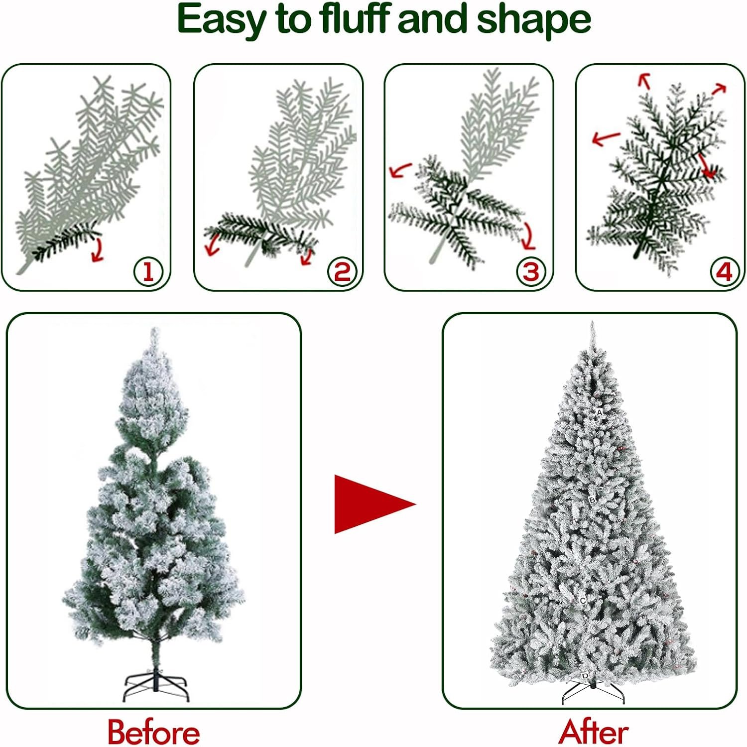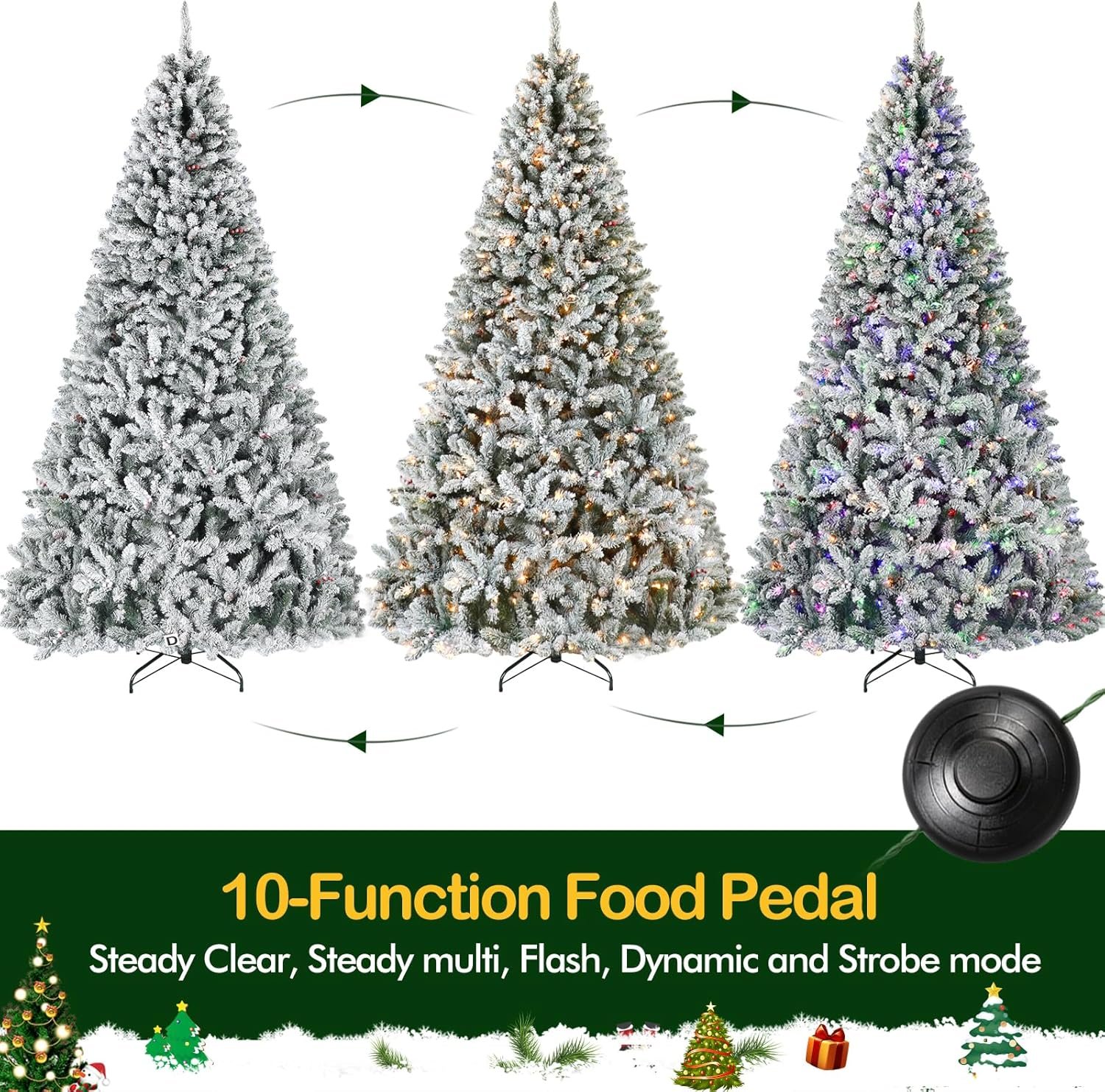 PRE-LIT CHRISTMAS TREE: The 7.5ft snow flocked Christmas tree add a mesmerized festive atmosphere to your home by changing 450 pre-strung lights from warm white to multicolor with the touch of a button. The bulbs are UL certificed, safely designed to remain lit even if one burns out. Included is a foot pedal switch to control 10 different light colors and actions.