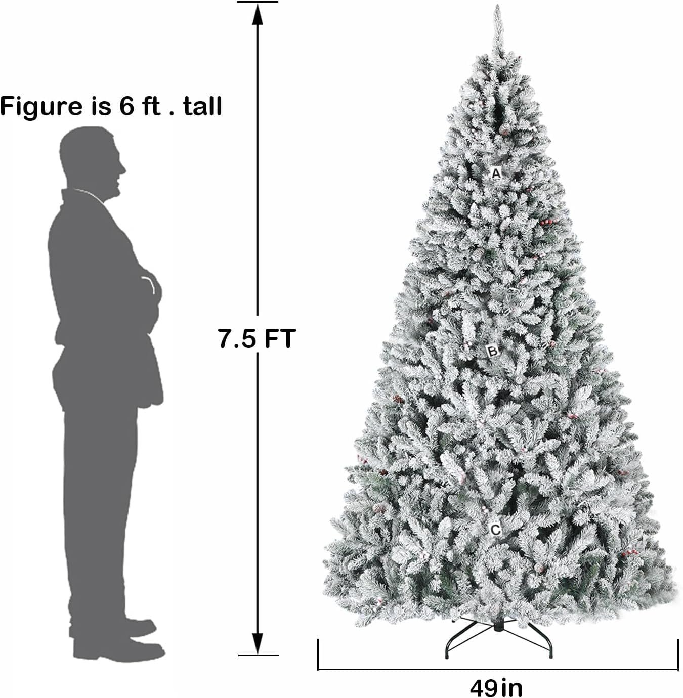 NATURAL APPEARENCE & Full LOOK: Measures 7.5 feet tall, 49 inches diameter at the base, the prelit Christmas tree features snow sprinkled branch tips trimmed with pine cones and clusters of red berry creates a wintry feel and 1446 branch tips for a full and life-like look, which can be easily fluffed and shaped for a splendid and natural display and also provides abundant space to showcase your favorite ornaments.