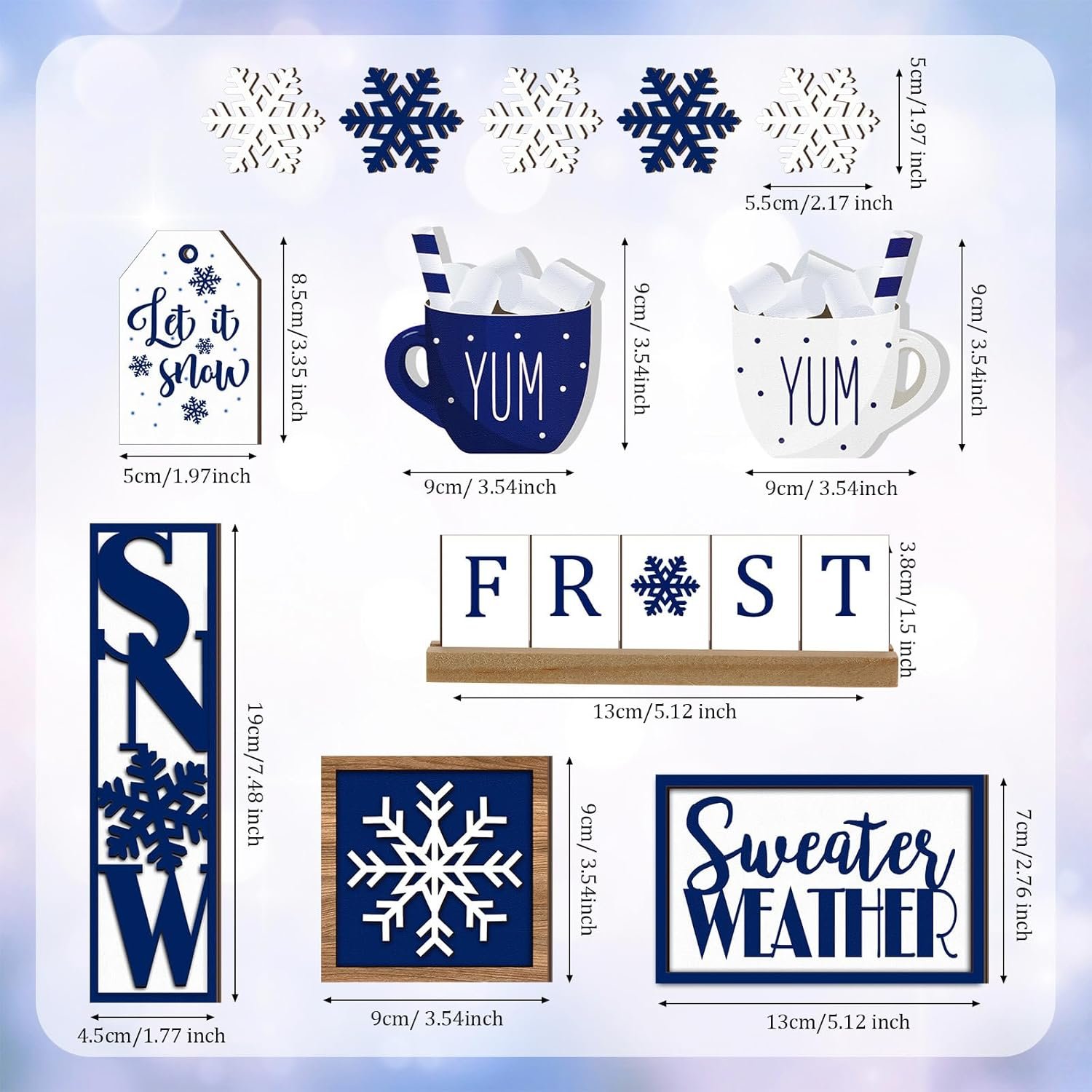Jetec 12 Pieces Christmas Tiered Tray Decor Winter Snowflake Wooden Sign Table Decorations Farmhouse Coffee Bar Signs Snowflake Winter Tray Decor for Home Xmas Holiday Tabletop(Blue)