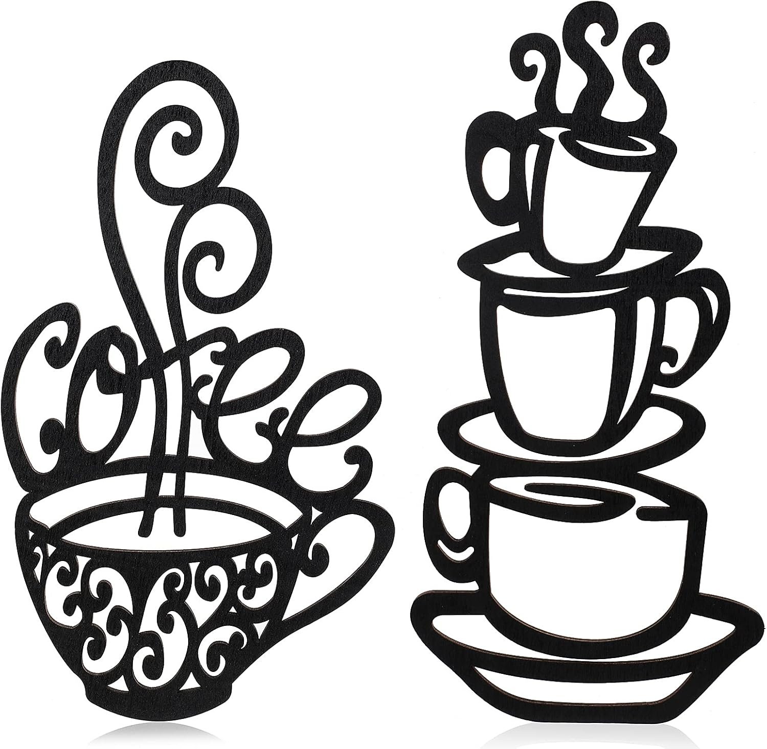 Jetec 2 Pieces Coffee Cup Wall Decor Black Coffee Cup Silhouette Wood Wall Art Cafe Themed Wall Art Cup Mug Scrolled Silhouette Metal Wall Art Decor for Coffee Shop, Kitchen, Restaurant