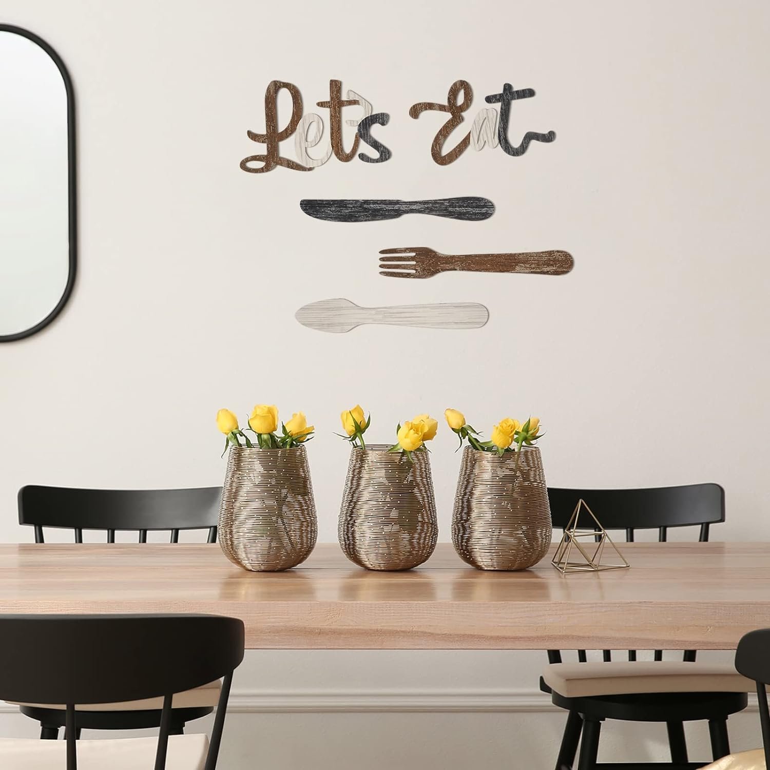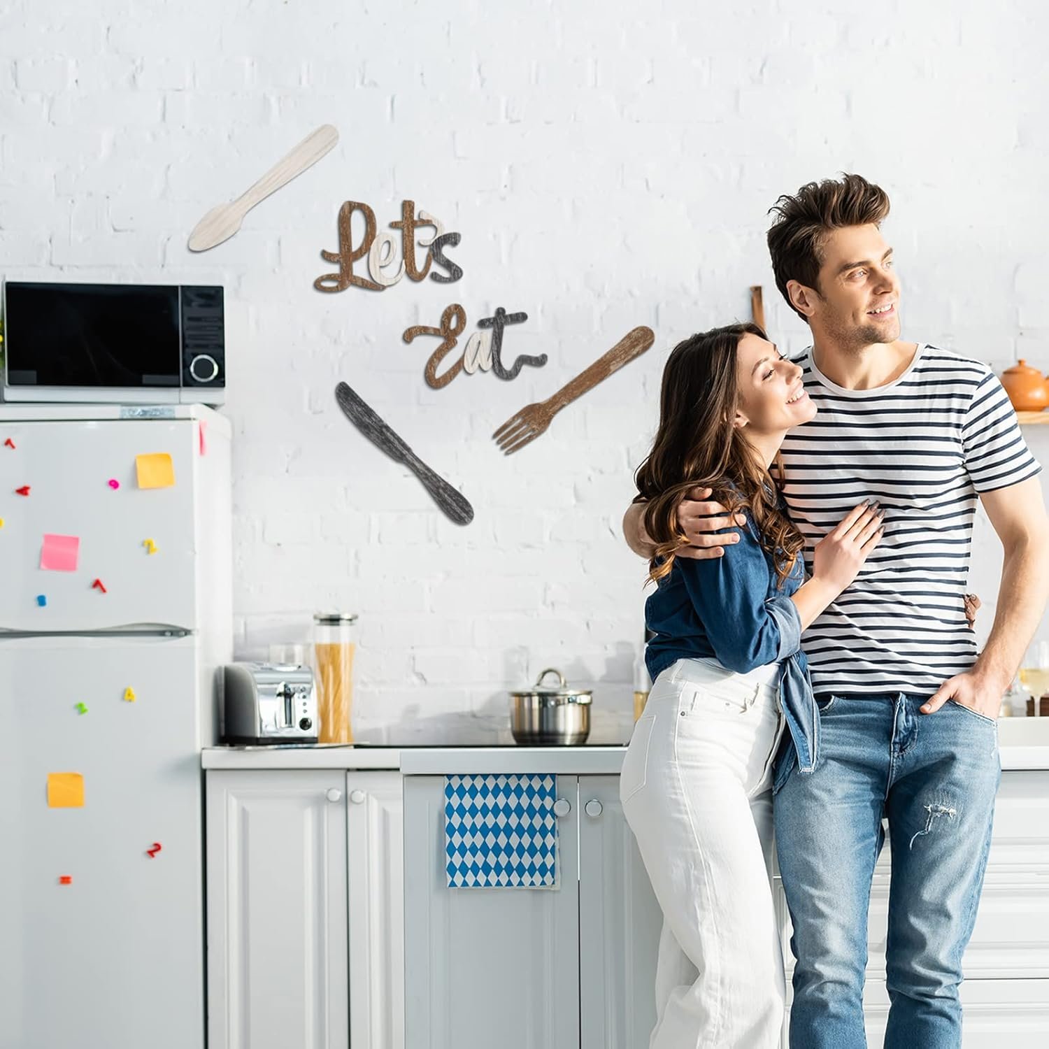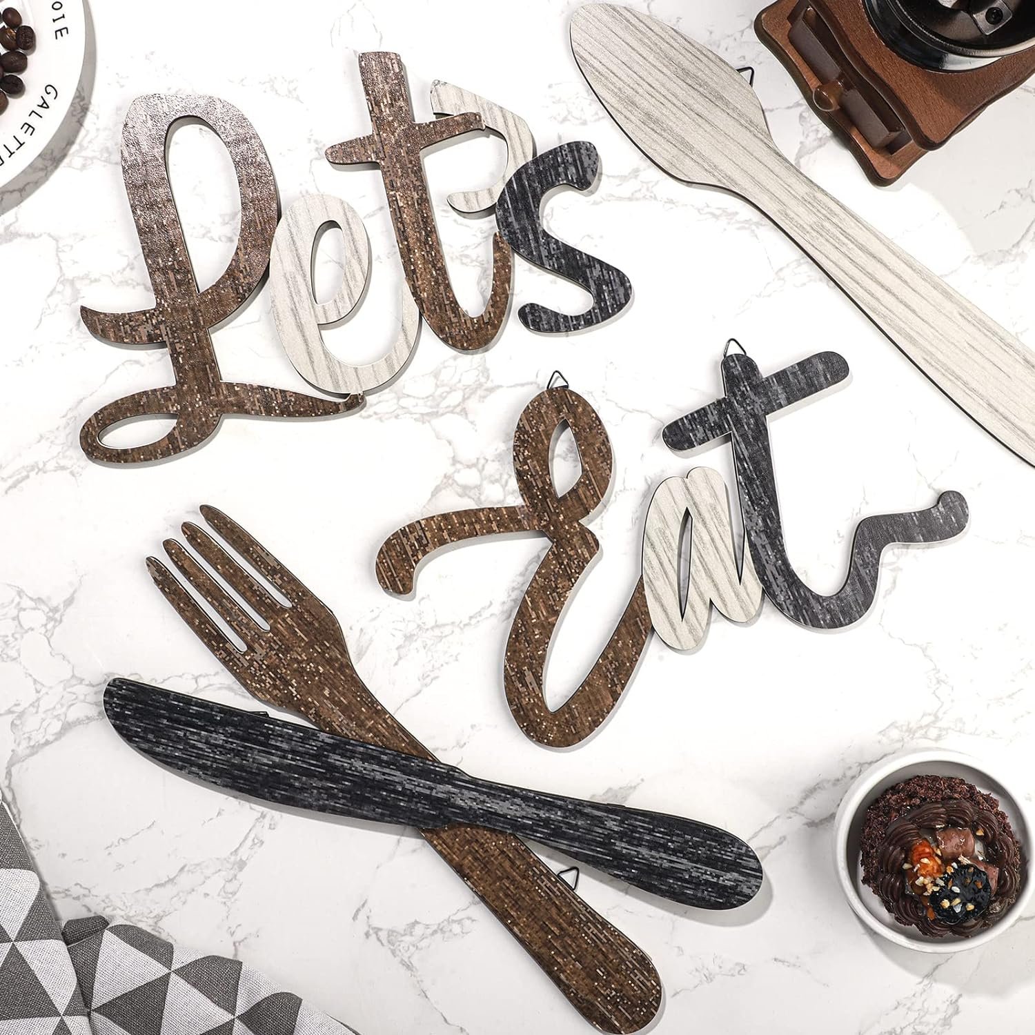 Exquisite appearance: you will receive 5 piece of kitchen decor, including Let’s and eat, a knife, a fork, and a spoon; Nice combination will bring you a nice using experience and become delicate decorations in your kitchen which combined rustic and modern feeling together, is sure to become a nice addition to your house