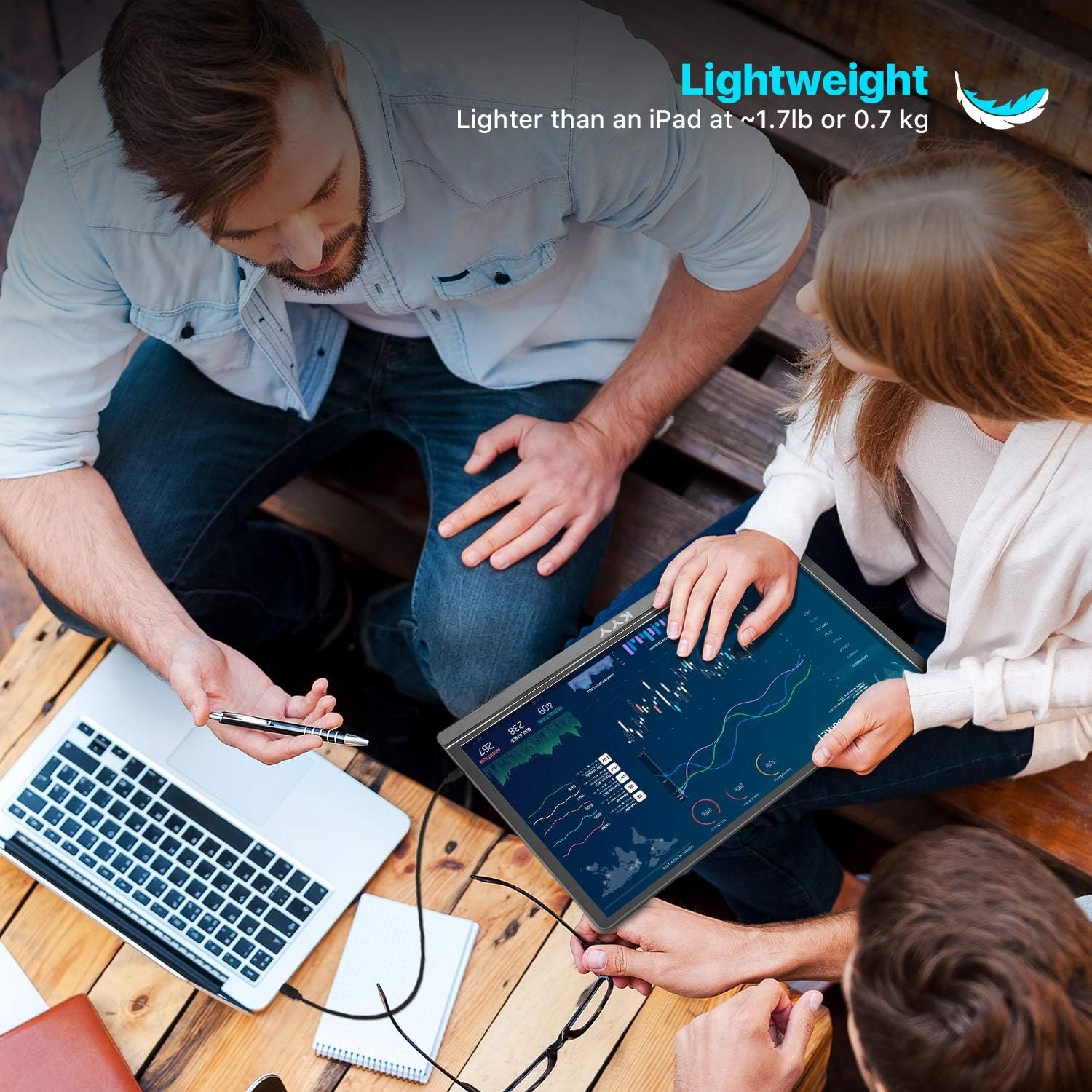 [ ULTRA-SLIM PORTABLE DISPLAY ]: KYY USB C portable monitor features a 0.3inch ultra-slim profile(1.7lb), it is easy to slides into your bag, allows you to carry it everywhere, ideal for a simple on-the-go dual-monitor setup or extend your phone screen for movies or games. No driver needed and equipped with 3.5mm audio inputs and 2 built-in stereo speakers to enhance entertainment experience