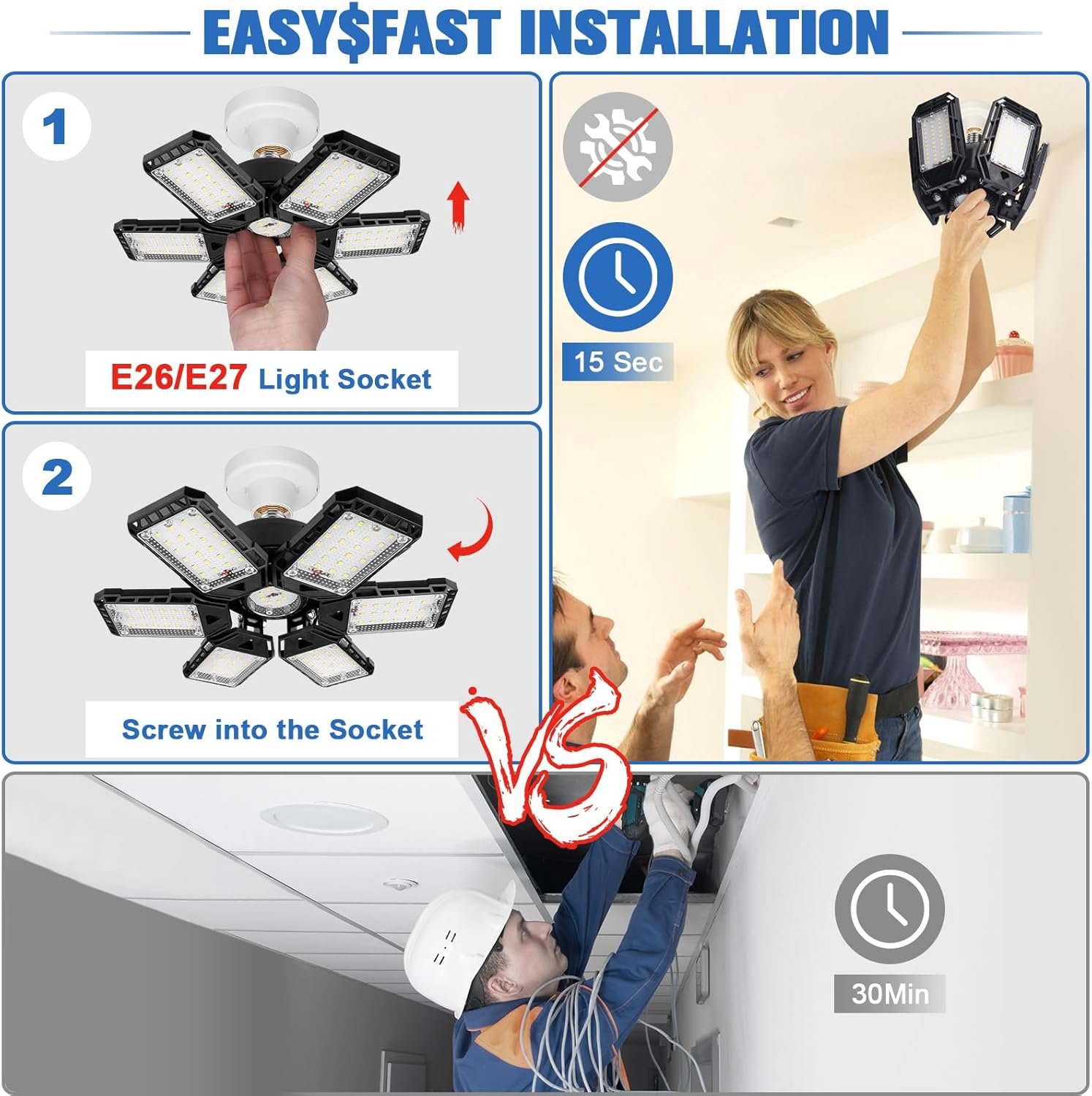 【Safety & Energy Saving】Upgraded Garage Lighting Bulb is made of high quality aluminum heatsink and each panel features a unique hollow-out design that make a better heat dissipation. Make lifespan more than 50000 hours , and equivalent to 6 traditional light bulbs, more than 85% energy saving than traditional lamp. They are good led lights for garage.