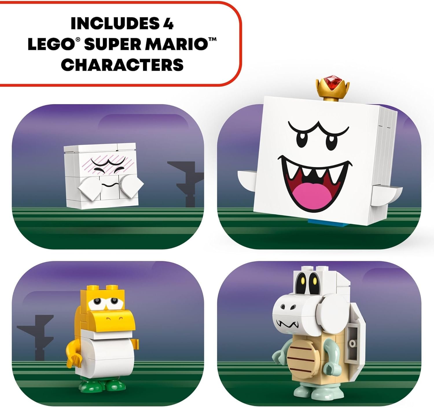 Includes 4 LEGO Super Mario video game toy figures – King Boo, a Yellow Baby Yoshi, a Dry Bones and a Boo