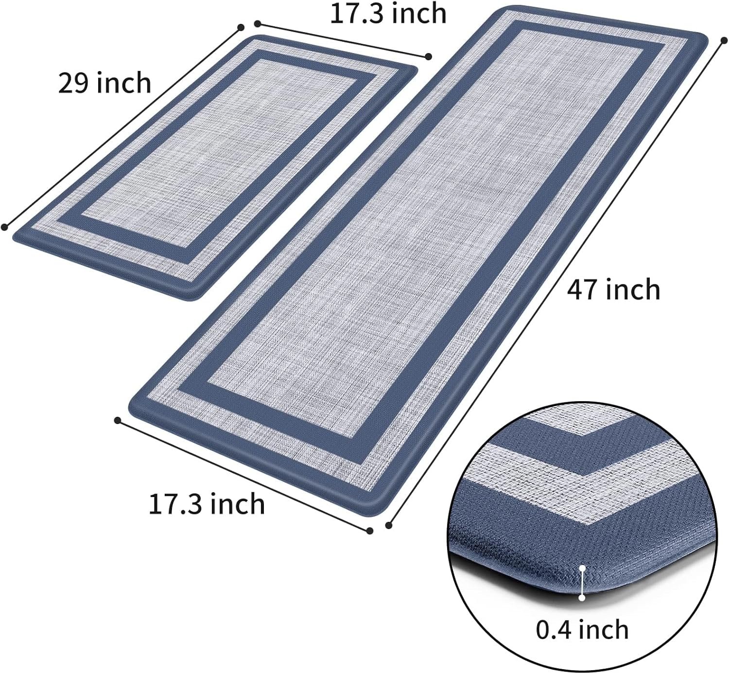 Stylish & Versatile: The 2-pack rugs for kitchen are measured as 17.3 x 47 inches and 17.3 x 29 inches in dimension.The pattern and color compliment kitchen / room nicely and make the foam mats perfect for home or commercial use in areas such as hair salons, office, farmhouse,in front of sink or any other high-traffic indoor or outdoor space.