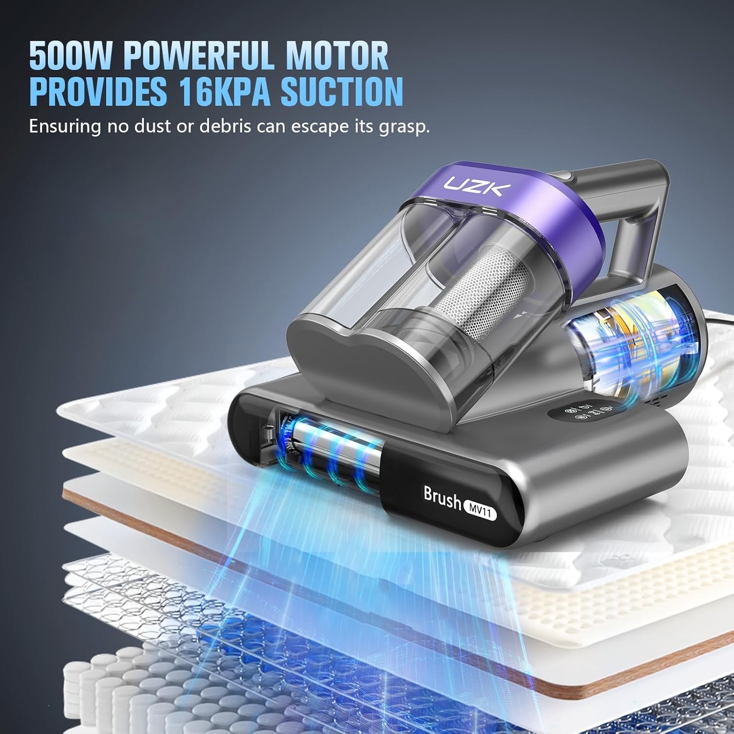 POWERFUL SUCTION AND EFFICIENT KNOCKING: Our mattress vacuum provides suction power of up to 16Kpa with a consistent 500W output, making it easy to remove dust and dirt from beds, pillows, mattresses, and sofas. The metal strip roller brush is designed to avoid scratching sheets and other fabrics while preventing hair from tangling, giving you a healthier and more comfortable home.