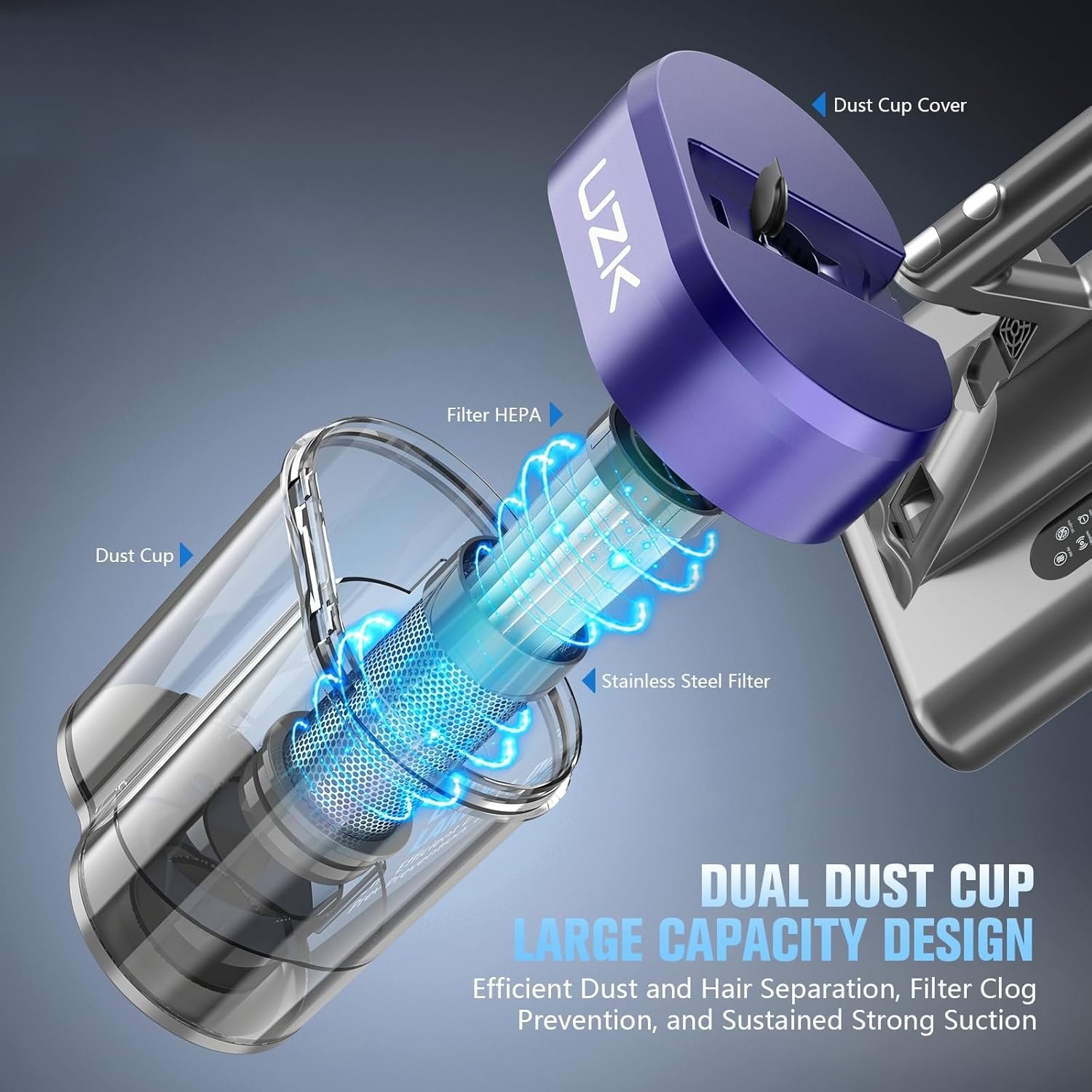 LARGE CAPACITY DUAL DUST CUP DESIGN: Our mattress vacuum cleaner features a dual dust cup setup that includes a cyclone separation chamber and a dust collection chamber. This design efficiently separates dust and hair, prevents filter clogging, and ensures powerful suction.
