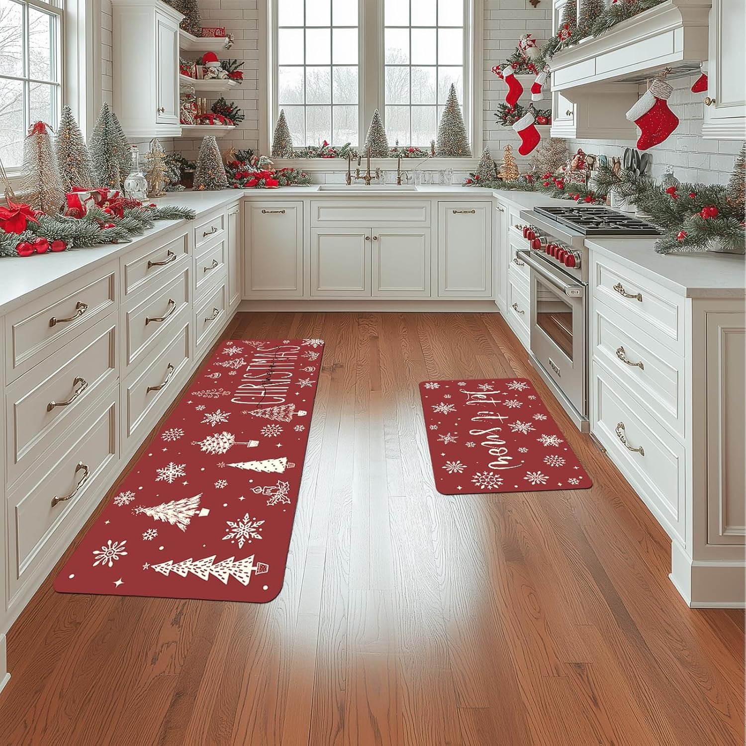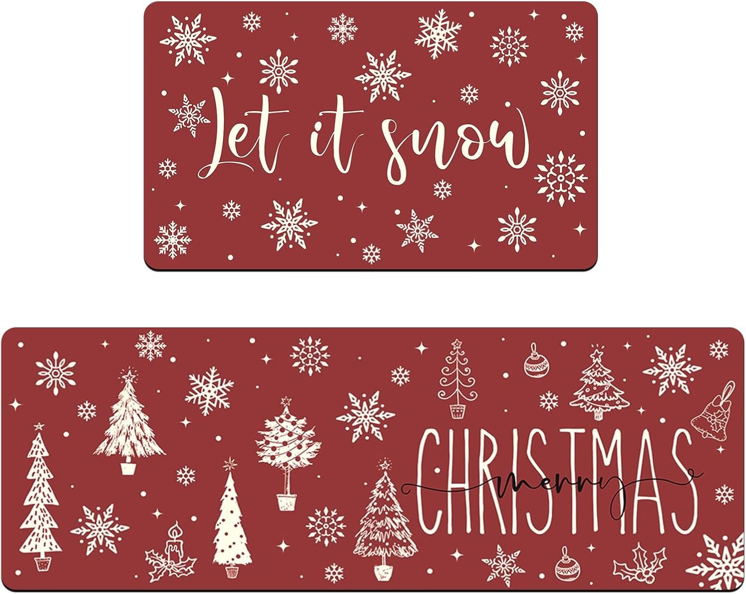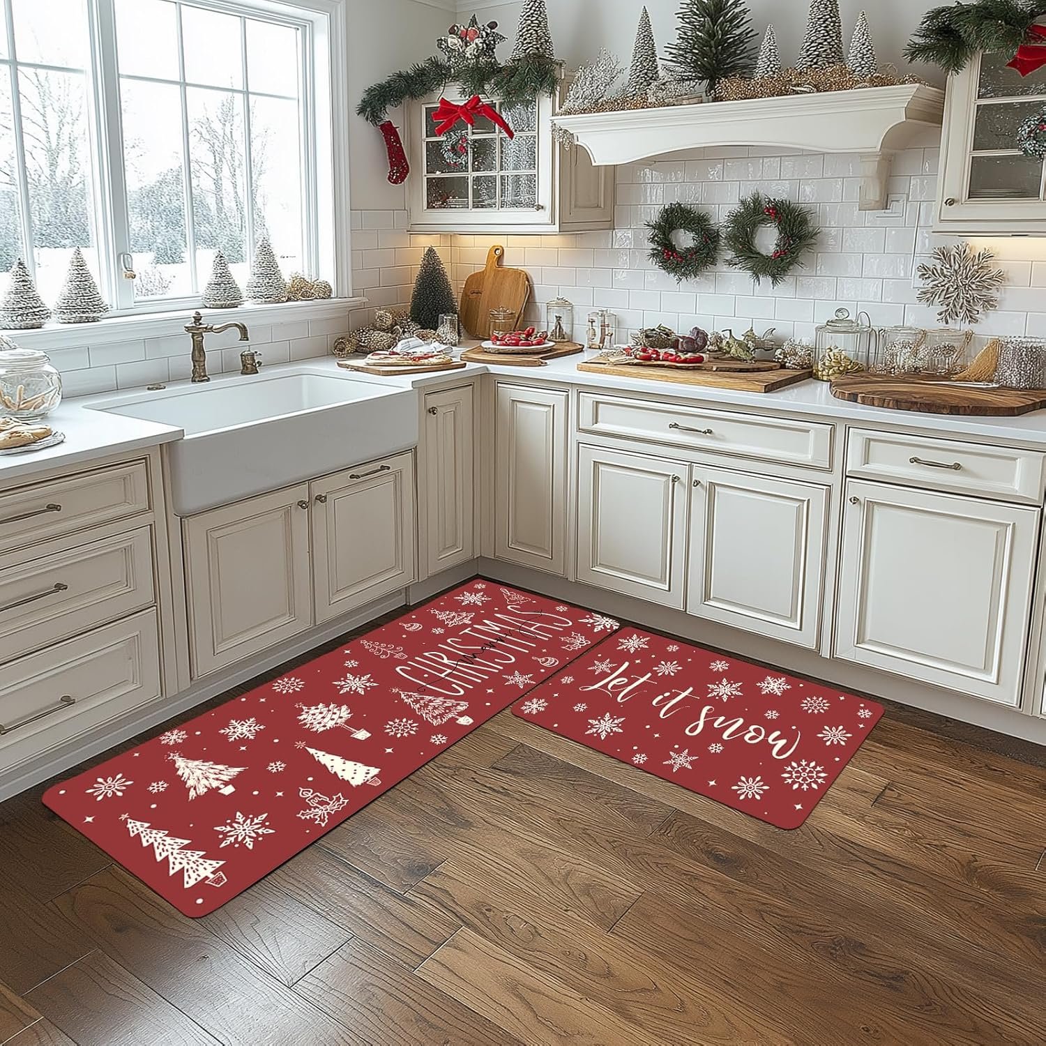 Merry Christmas Kitchen Rug Xmas Trees Winter Snowflake Let It Snow Kitchen Mats Set of 2 for Christmas Home Decor Low-Profile Kitchen Rug Set, 17x 30” and 17x 47” (Red, 17”x 30” + 17”x 47”)