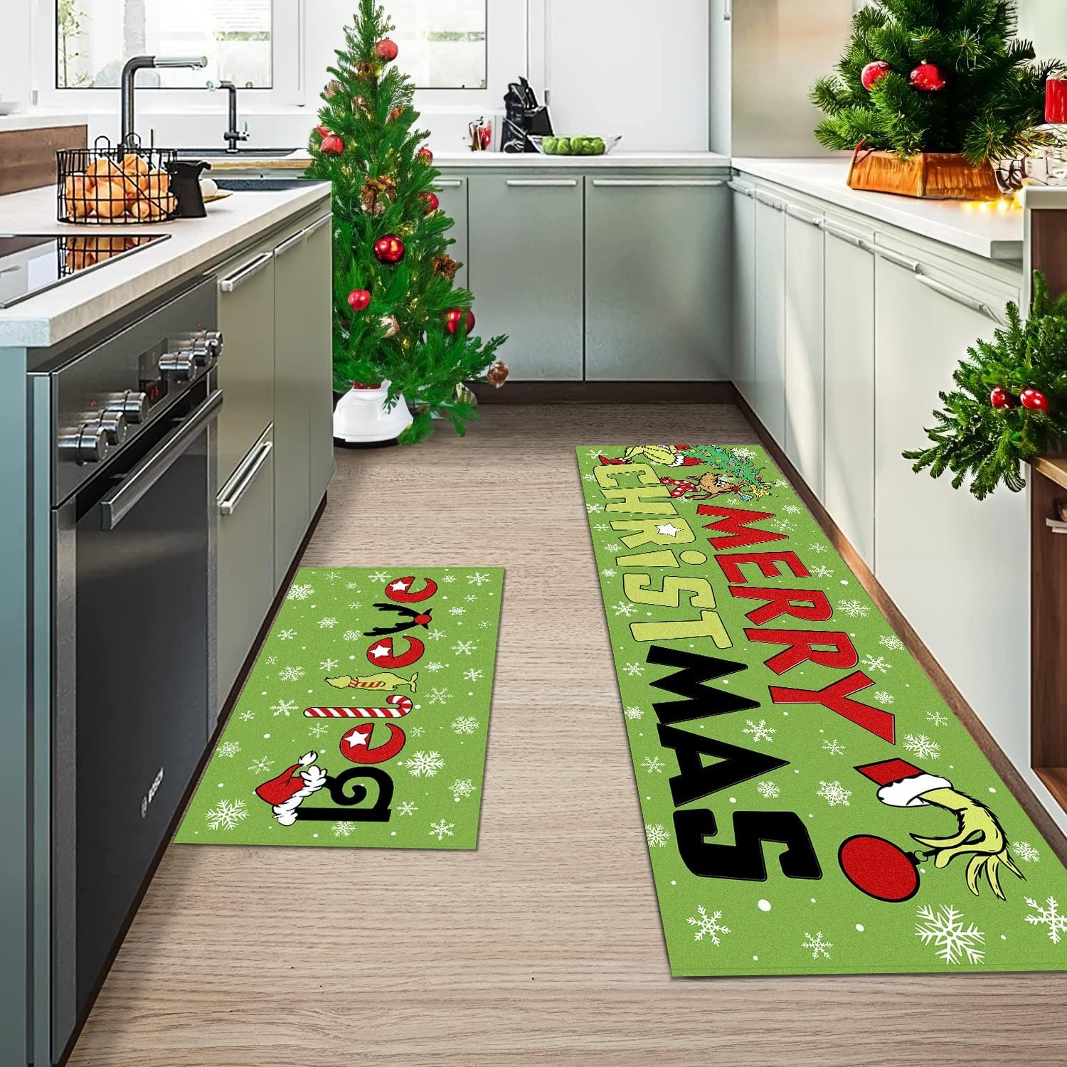 Christmas Rugs Set : Enhance your Christmas kitchen decor with our non-slip Christmas kitchen rugs set. This 2-piece set includes two different sizes, 17″ x 29″ and 17″ x 47″, perfect for adding festive charm to any kitchen space
