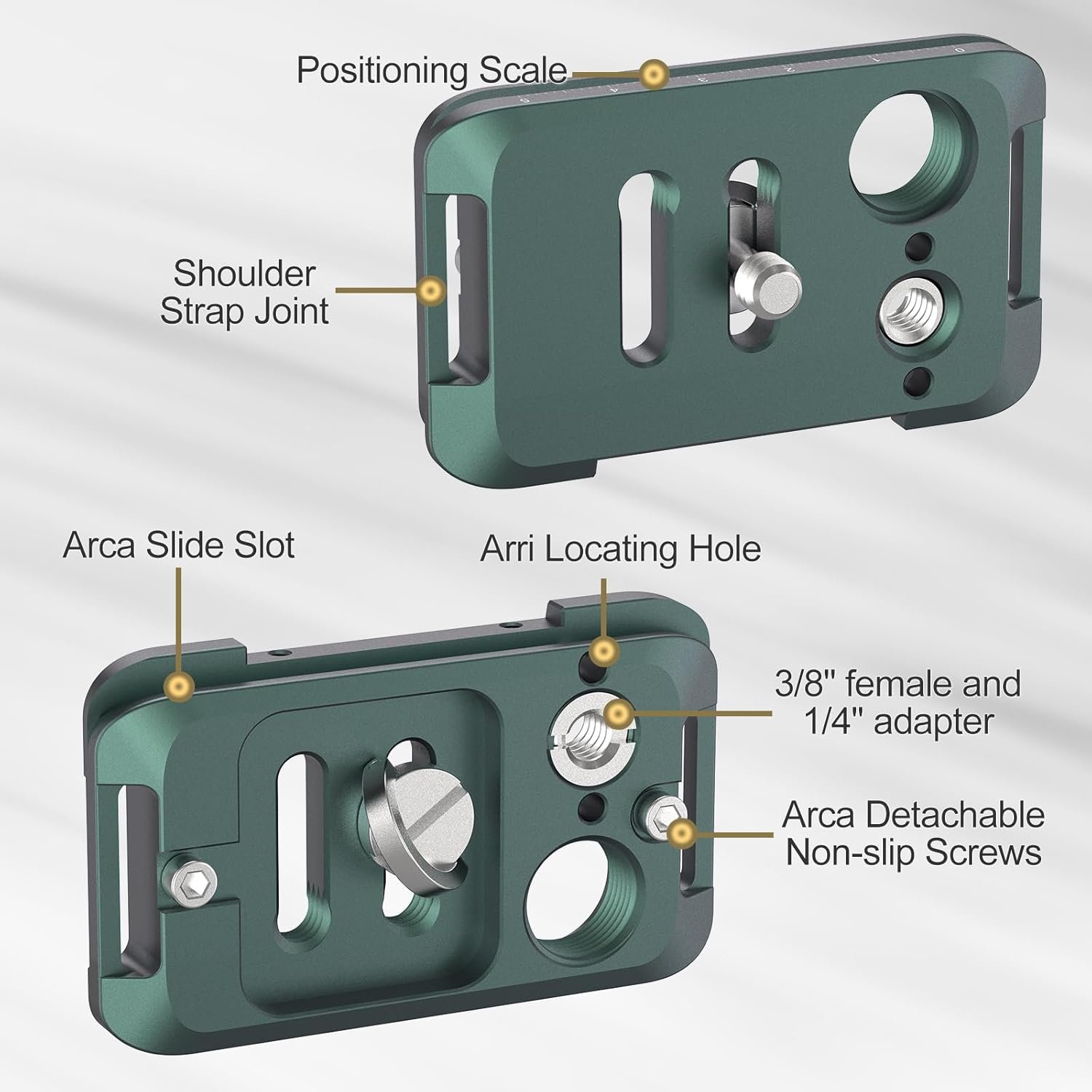 This quick release plate features two shoulder strap joint loops for camera straps, easy to carry equipment with you.