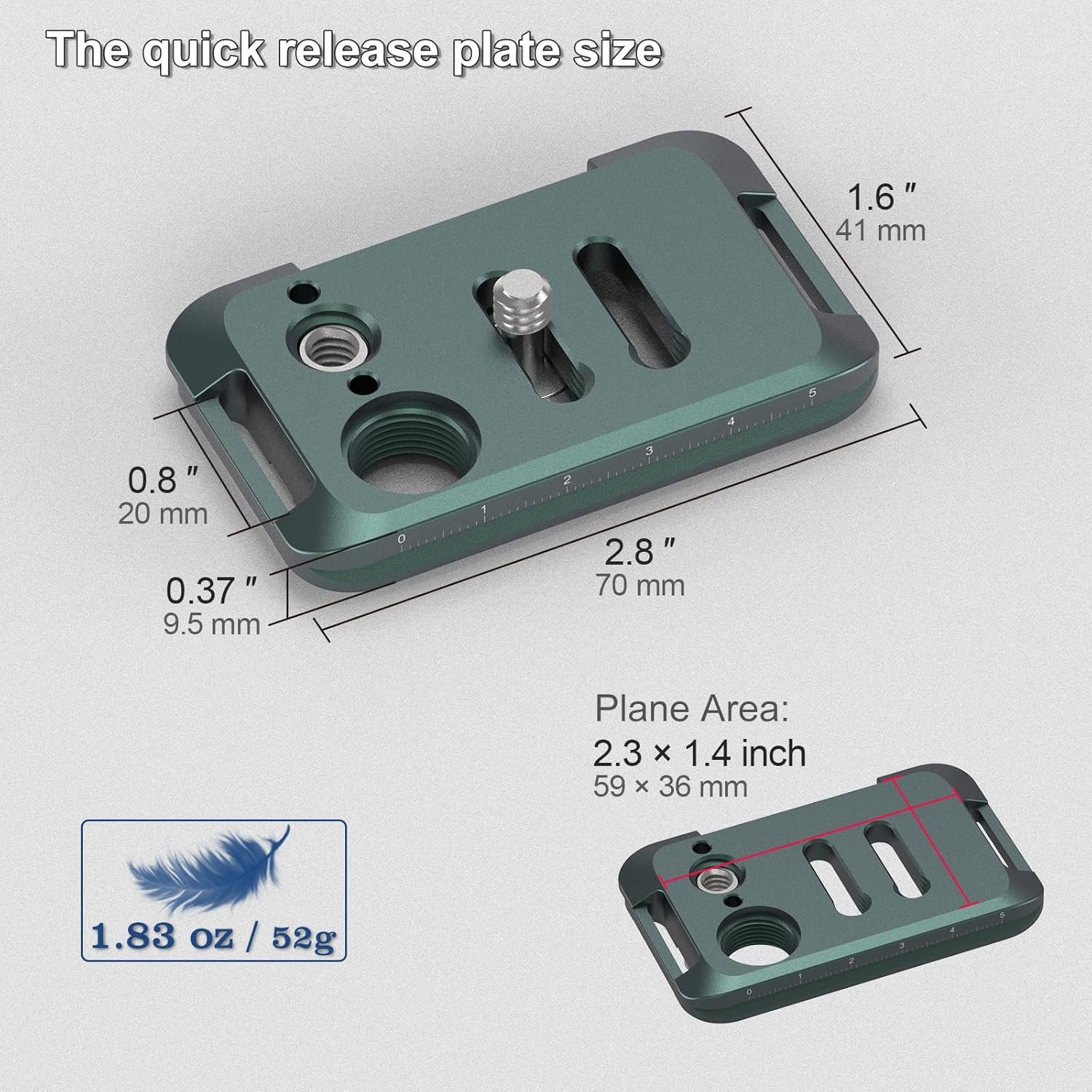 The quick release plate’s plane of mach size: 59 mm x 36 mm/2.3 inch x 1.4 inch