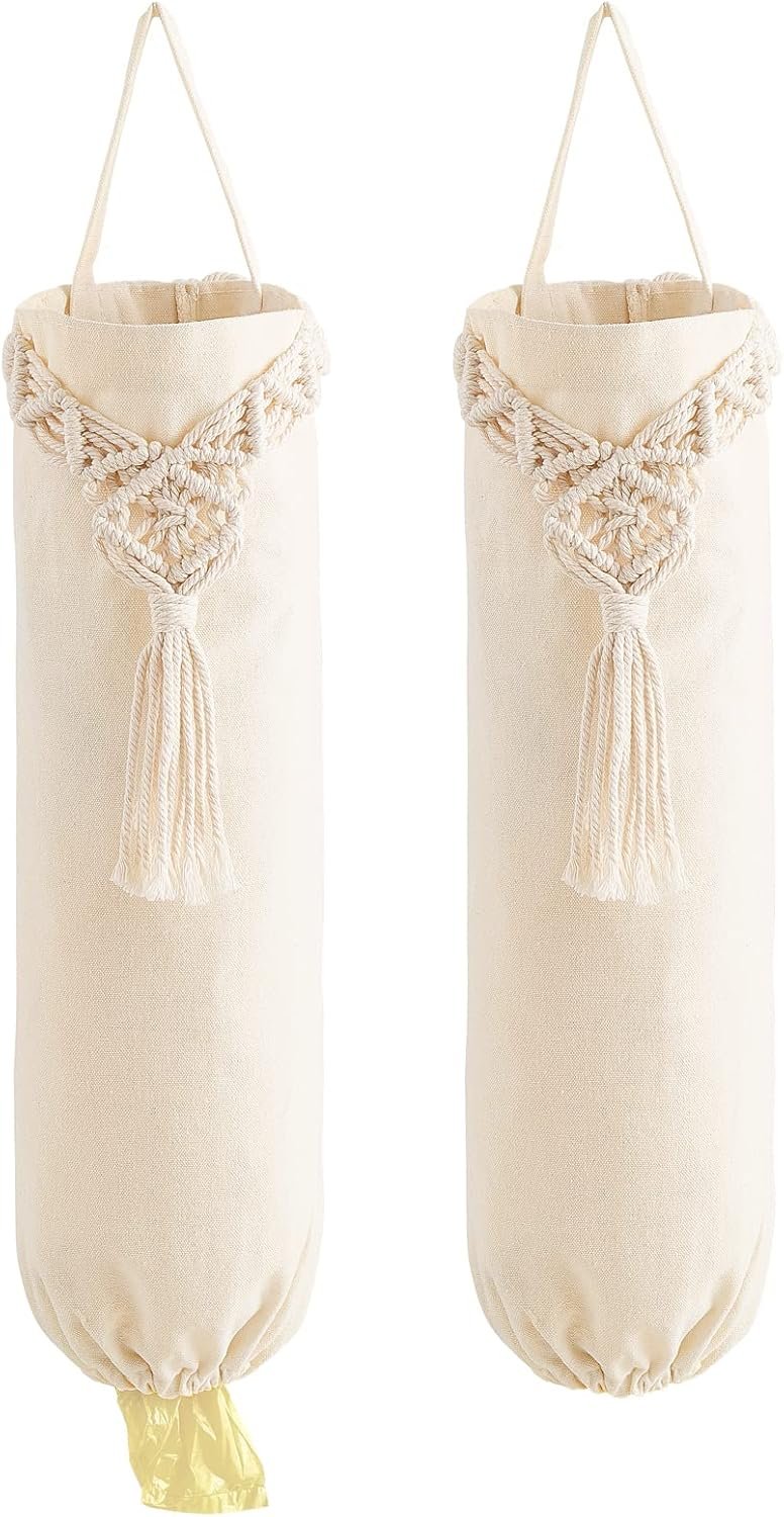 Mkono 2 Pack Macrame Plastic Bag Holder Grocery Bags Organizer Trash Bag Dispenser Camper Boho Decor Shopping Bag Storage for Kitchen Closet Pantry Laundry Room, Ivory, 9”W x 21”L