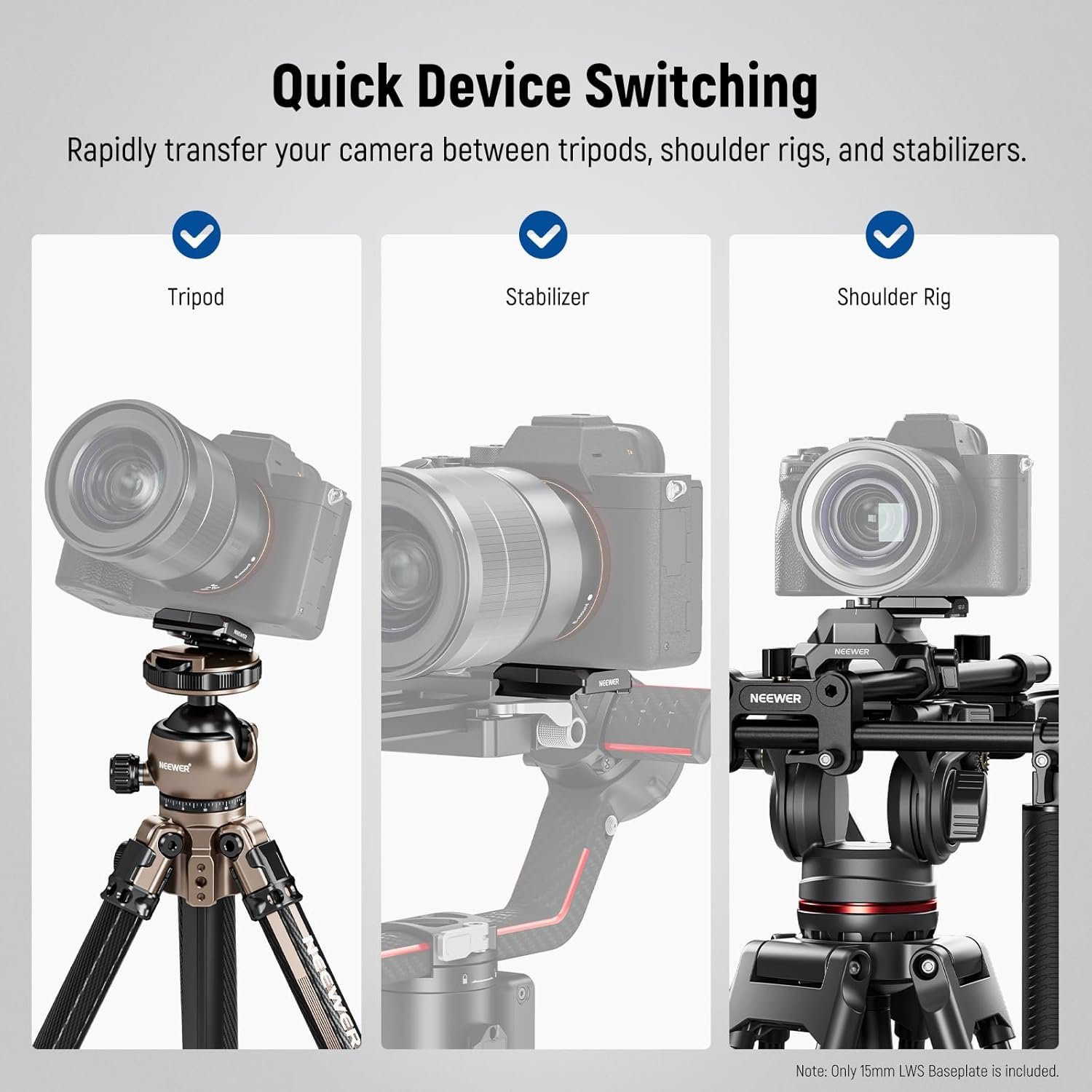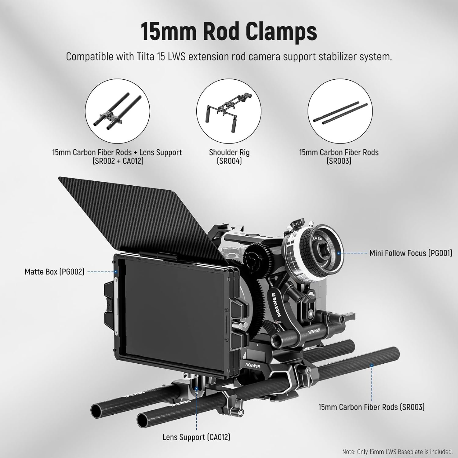 【For 15mm LWS Rigs/Accessories】 With dual 15mm rod clamps (60mm rail gauge), the camera baseplate can work with NEEWER SR004 Shoulder Rig, PG002 Matte Box, PG001/PG003 Mini Follow Focus, CA012 Lens Support, SR002/SR003 Carbon Fiber 15mm rods, and other devices with the 15mm LWS support system. Also compatible with Tilta 15 LWS extension rod camera support stabilizer system