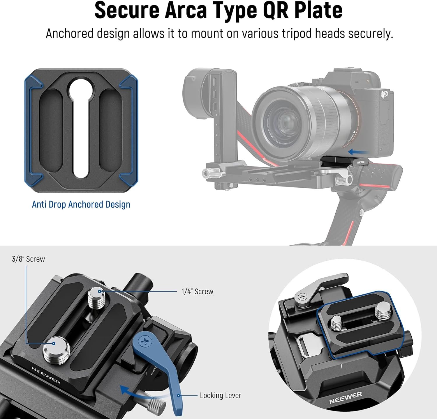 【Arca Type QR Plate for RS Gimbals】 The Arca type QR plate features a retractable anti off pin to prevent it from dropping, and it is compatible with DJI RS4 RS4 PRO RS3 RS3 PRO RS2 RSC3 stabilizers, enabling you to smoothly transfer the camera between two equipment. The clamp is compatible with SmallRig and NEEWER camera cages, and has a side lock for secure mounting