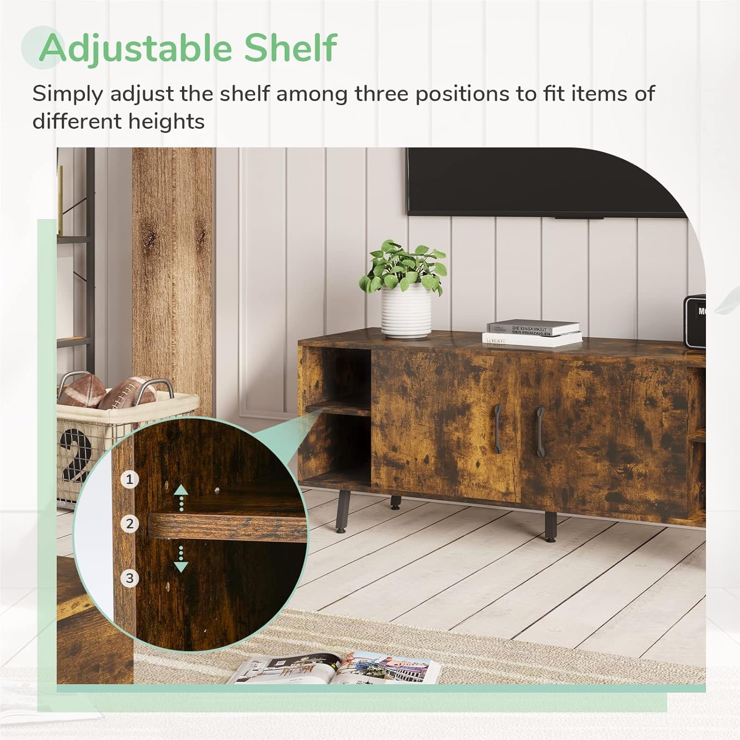 ③Open shelves: You can adjust the shelves to get the perfect space, and use the storage cabinet to put away electronics, books, or other products.