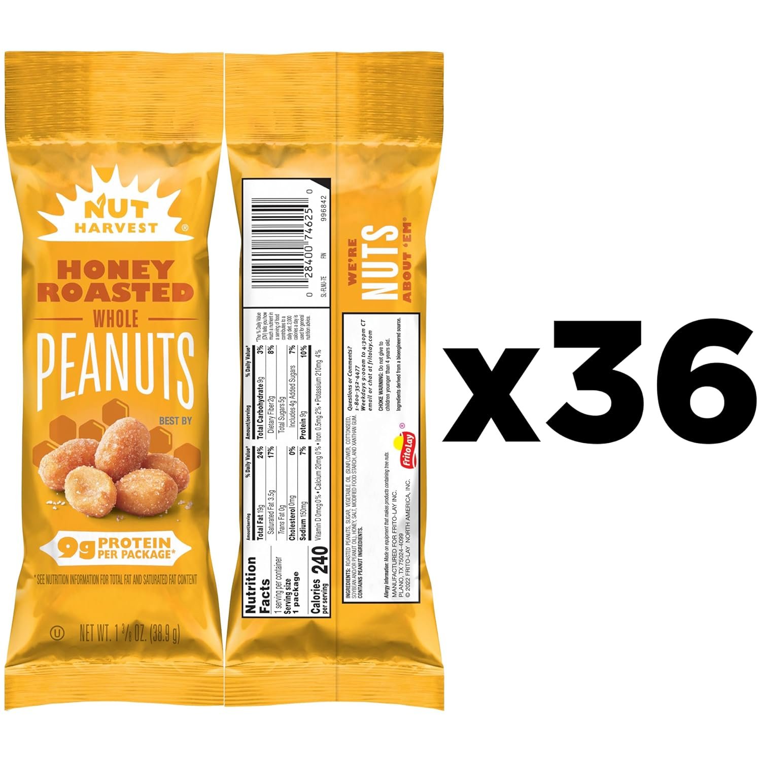 Includes 36 (1.375 oz) bags of Nut Harvest Honey Roasted Peanuts