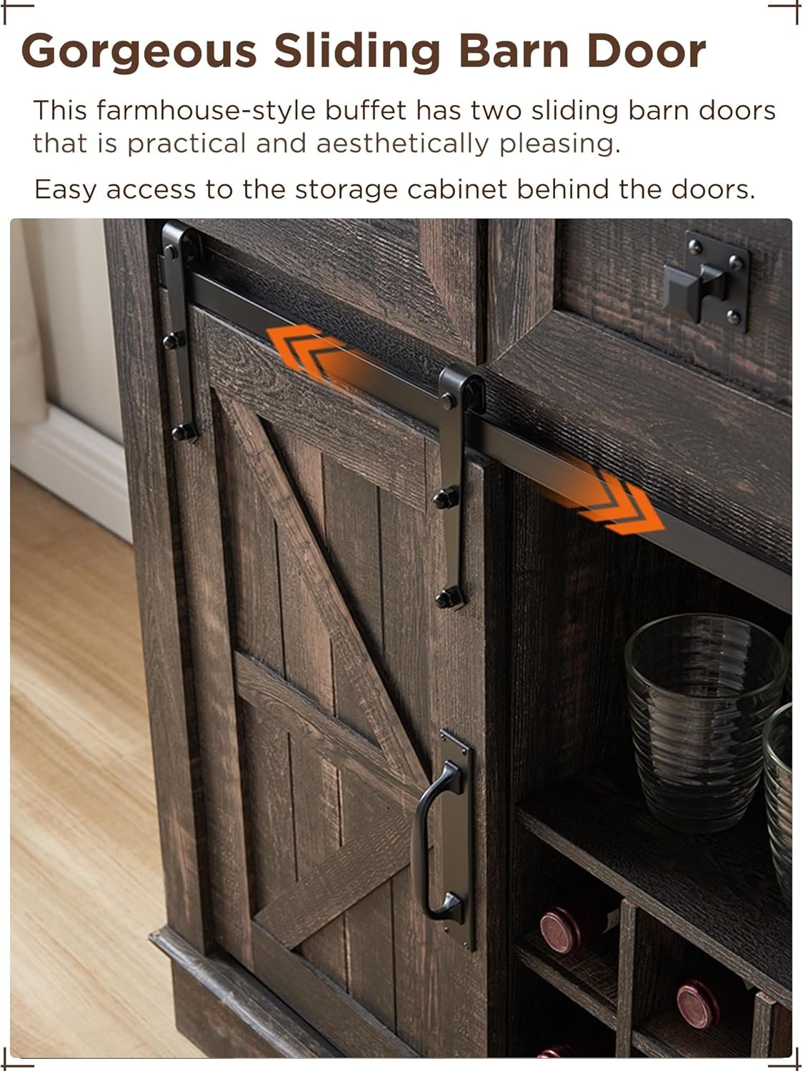 Farmhouse Home Bar Furniture with Sliding Barn Door: OKD Rustic wine cabinet features two flexible sliding barn doors allow easy access to cabinets and space saving. The sliding door with farmhouse sign create an elegant, farmhouse ambiance in your living space. Flexibly use it as a alcohol cabinet, kitchen pantry, china cabinet, coffee bar station, microwave stand, kitchen cupboard, credenza, storage cabinet.