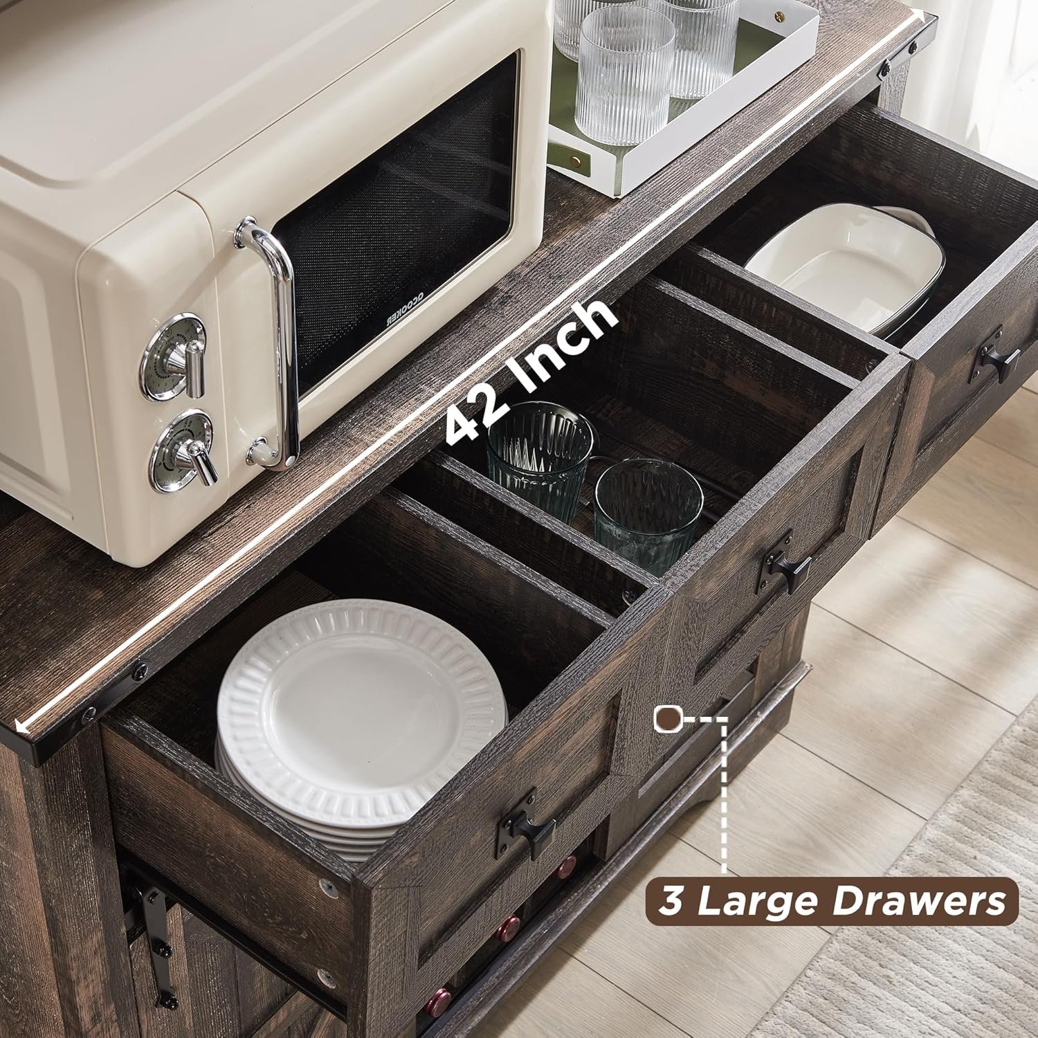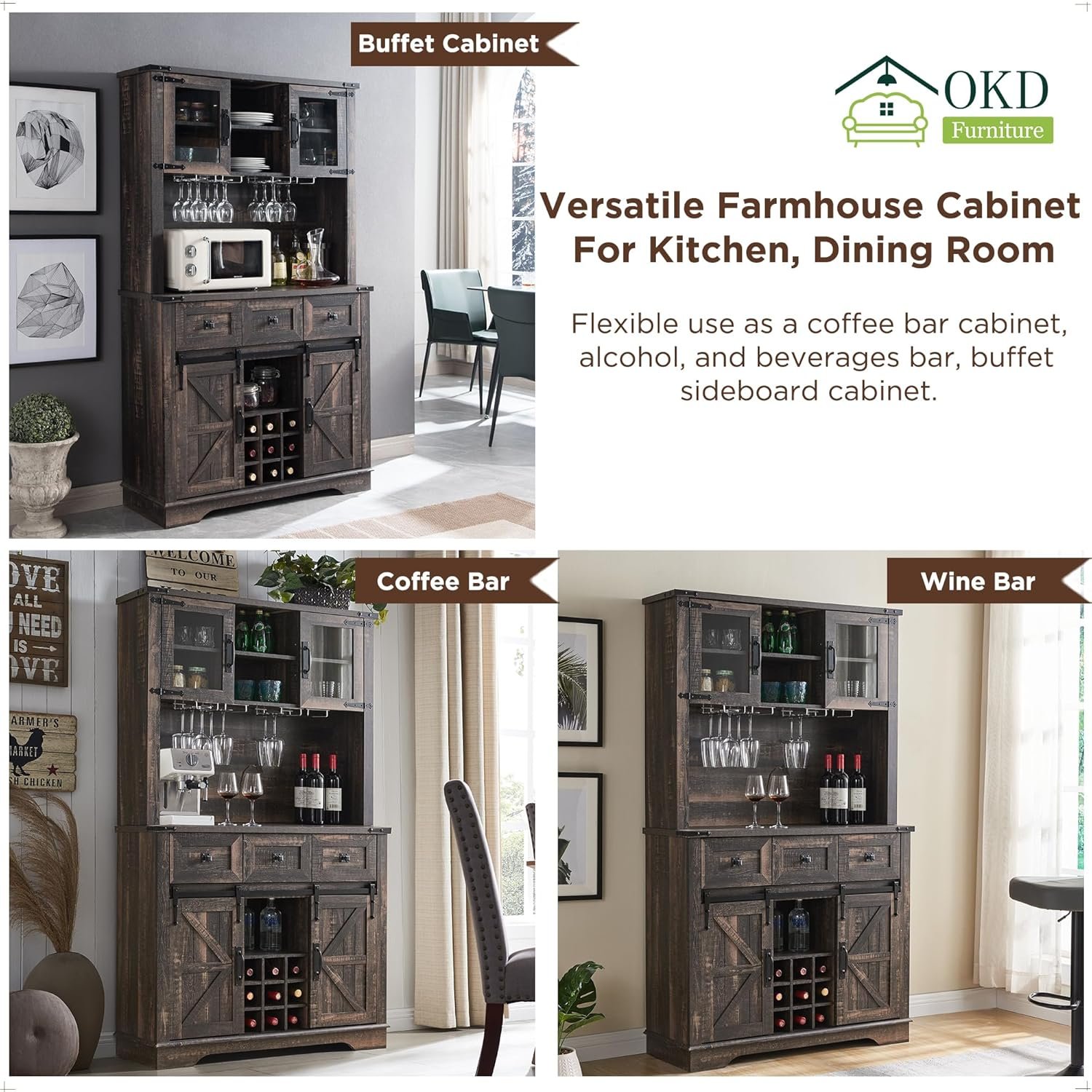 OKD 72″ Farmhosue Bar Cabinet with Sliding Barn Door, Large Kitchen Buffet with Hutch w/Wine & Glasses Rack, 3 Drawers, 12 Storage Shelves, Rustic Coffee Bar Sideboard Table, Dark Rustic Oak
