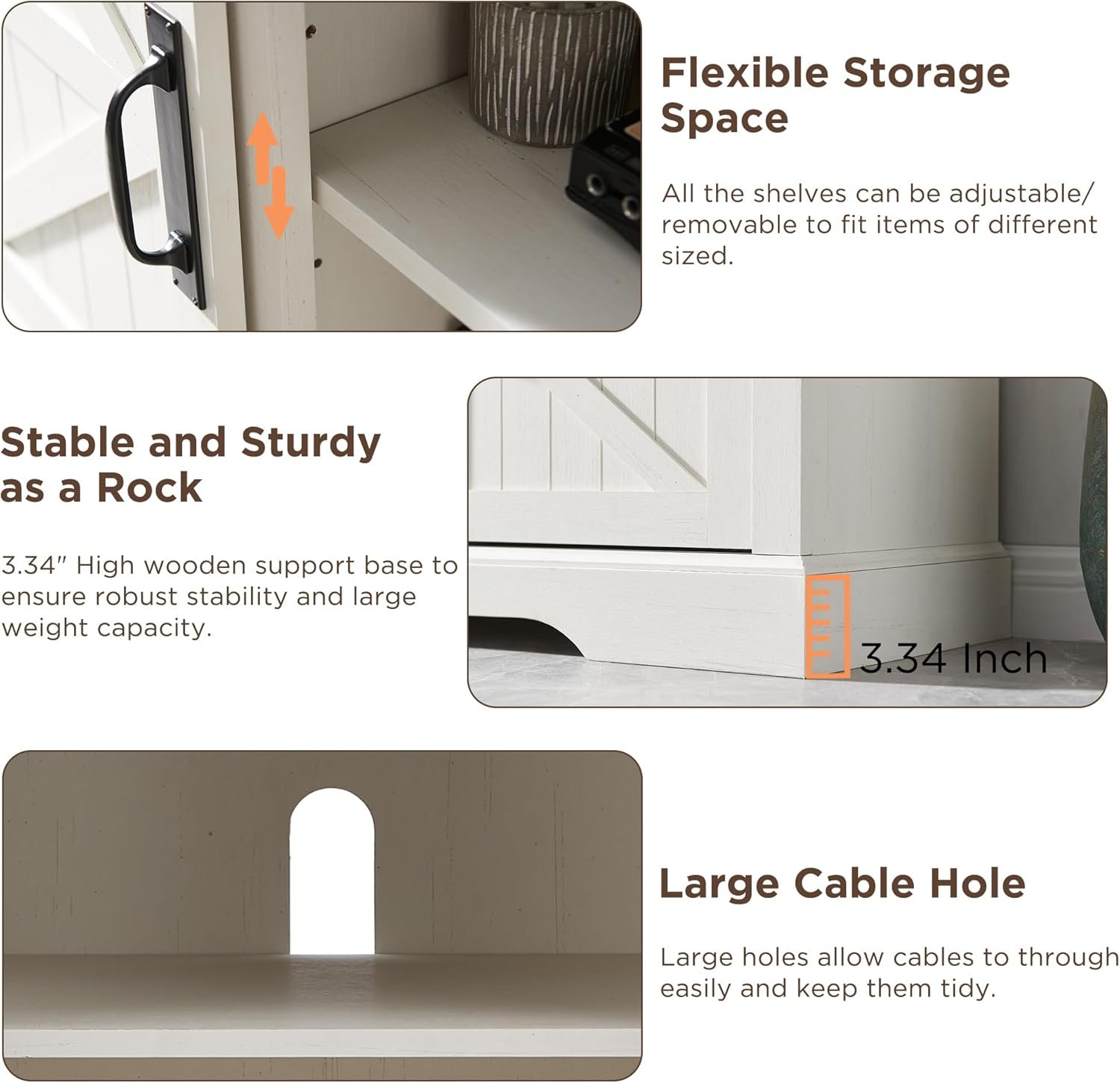 Ample and Flexible Storage: Classic sliding barn doors add sophistication to the space and allow you to hide clutter behind the doors, keeping the room neat and organized. Each storage cabinet has 1 removable and adjustable storage shelf to fit items of different-sized. 58″ wide tabletop fits tv up to 65″. Large cable/cord management cutouts to keep electronic wires organized.