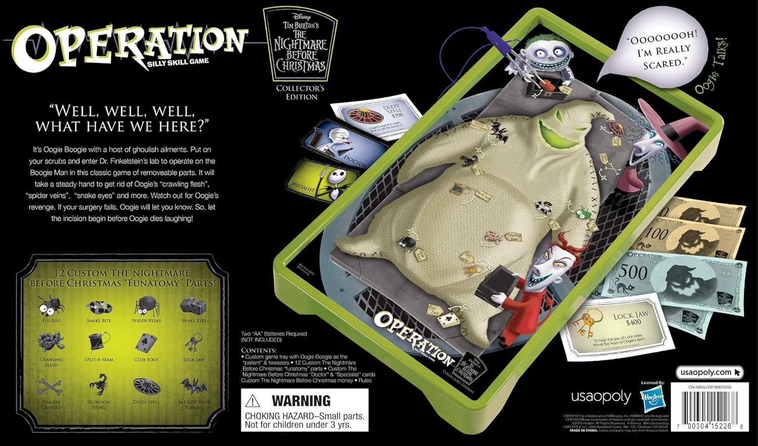 Tim Burton’s The Nightmare Before Christmas Collector’s Edition of Operation is a movie classic and allows fans the opportunity to be the surgeon and remove custom Funatomy parts from Oogie Boogie, the patient.