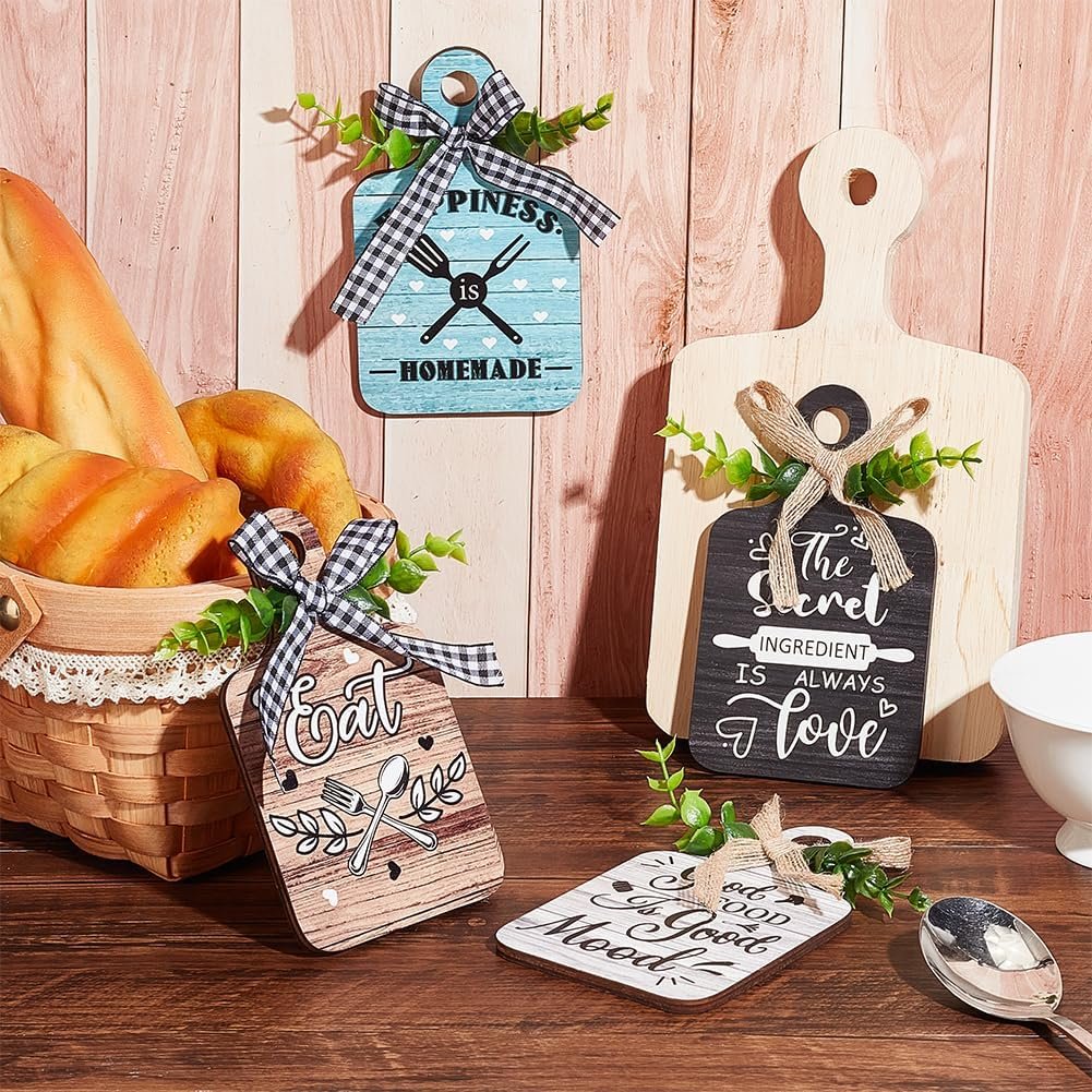Rustic Wood Sign: package includes 4pcs wood hanging boards in 4 styles–printed with pattern”eat”, “good food is good mood”, “happiness is homemade” and “the secret ingredient is always love”; each style 1pc, perfect country home decorations.