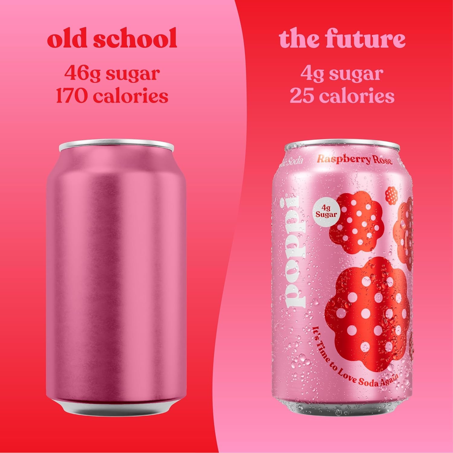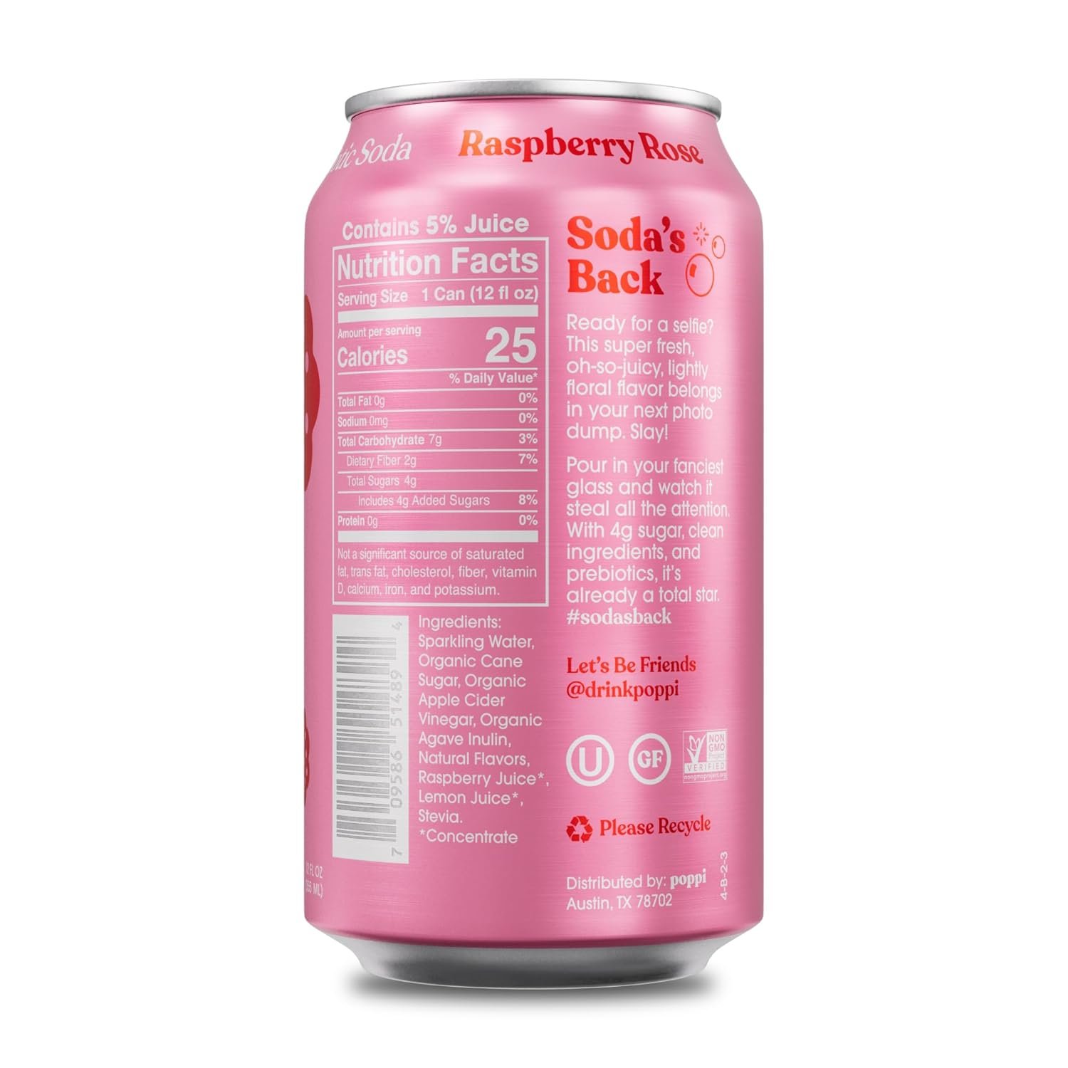 Poppi Sparkling Prebiotic Soda Beverage with Apple Cider Vinegar, Seltzer Water and Fruit Juice, Raspberry Rose Flavor, 12 oz, Pack of 12, Packaging May Vary