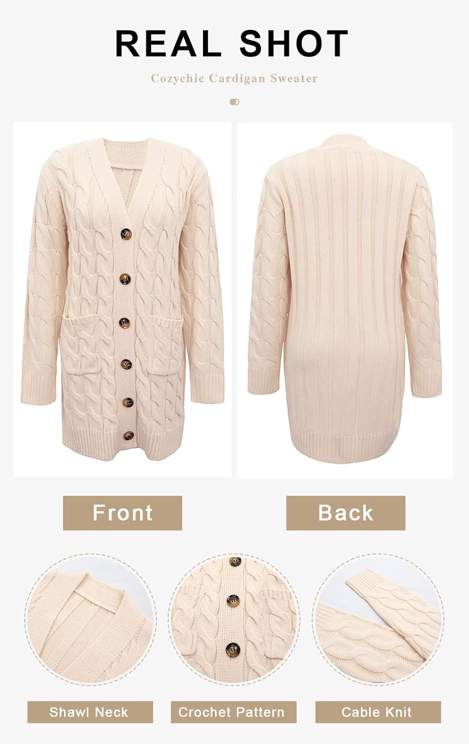Sweaters for Women Cardigan Open Front is the PERFECT layering piece for Fall and Winter!Features: Cozy Shawl Collar,Long Sleeve,Chunky Knit,Cable Knit,Open Front,Button Down,Crochet Pattern,Midi-Length,Solid Color,Ribbed Sweater,Two Functional Patch Pockets,Boyfriend Style,Lightweight Cardigan