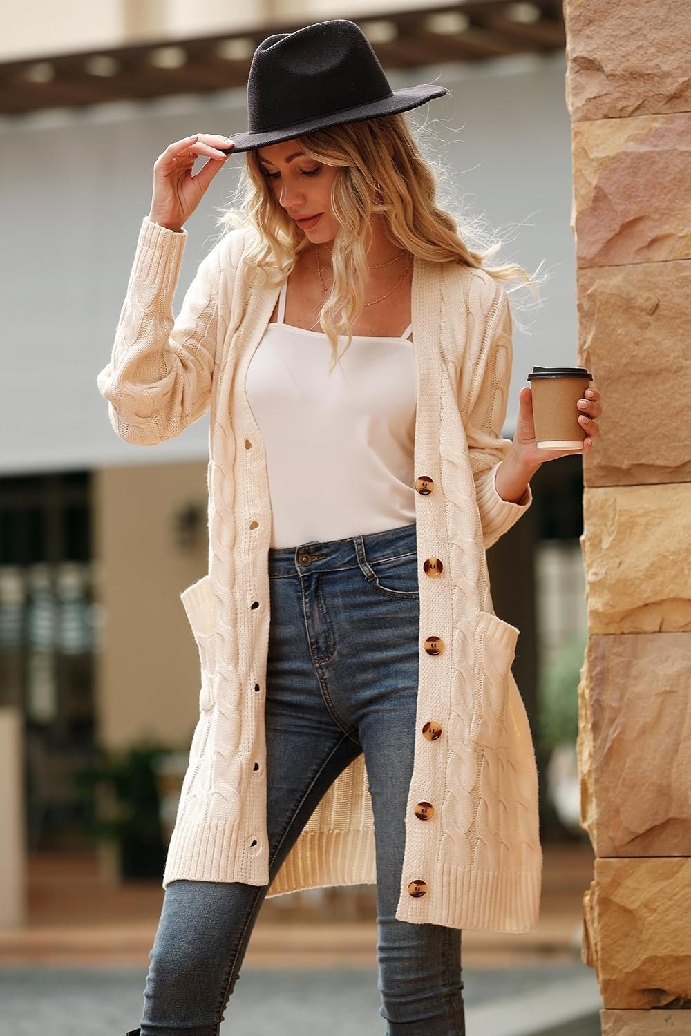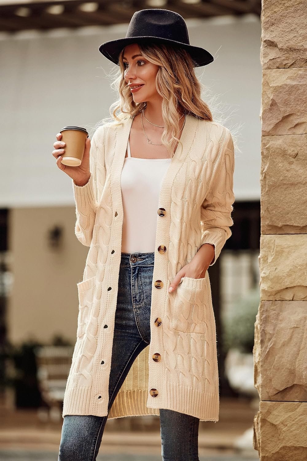 PRETTYGARDEN Long Sleeve Cable Knit Long Cardigan for Women 2024 Fall Winter Chunky Open Front Button Sweaters with Pockets
