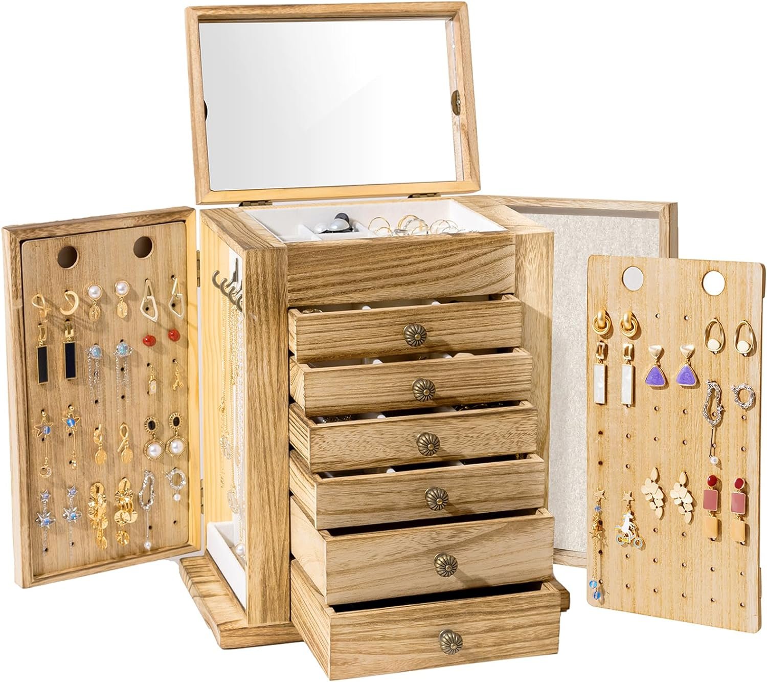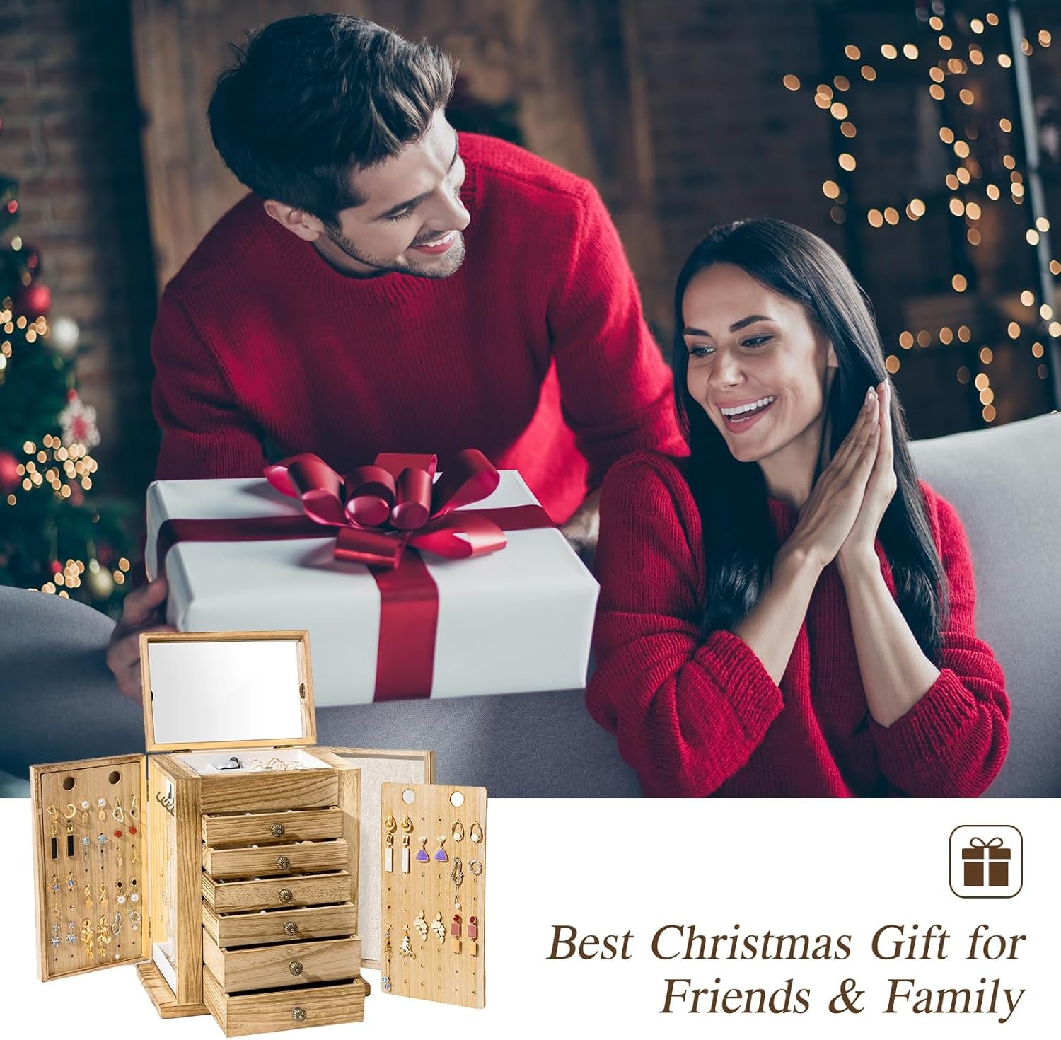 ProCase Large Jewelry Box, 7-Layer Wooden Jewelry Boxes for Women, Jewellery Holder Organizer Storage Case with Mirror for Earrings Bracelet Necklace for Dresser -Natural