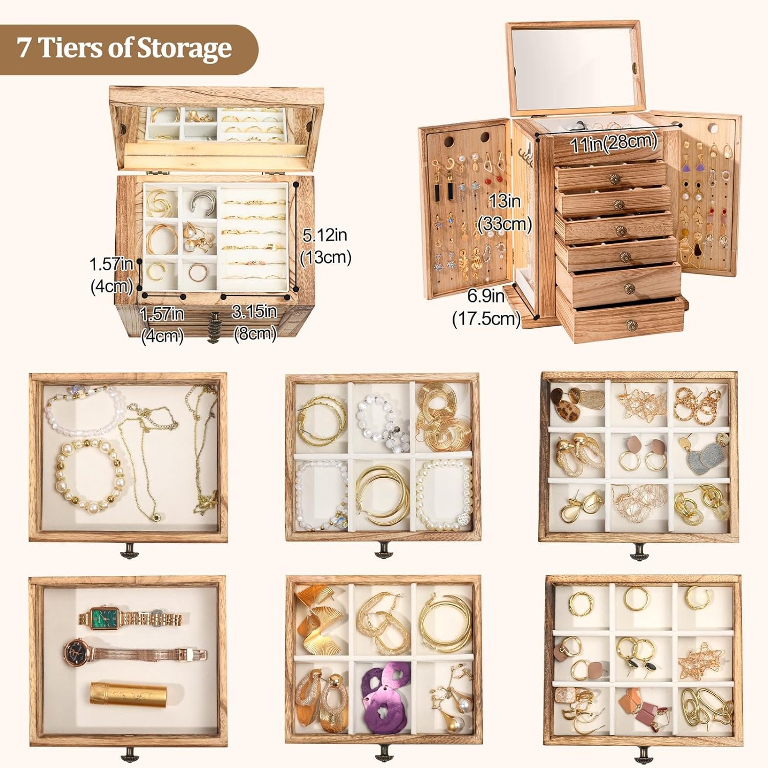 Size: 13” x 11” x 6.9”. Large 7-tier installation-free wooden jewelry box for keeping all types of jewelry like earrings, bracelets, necklaces, watches, rings, etc. neatly organized
