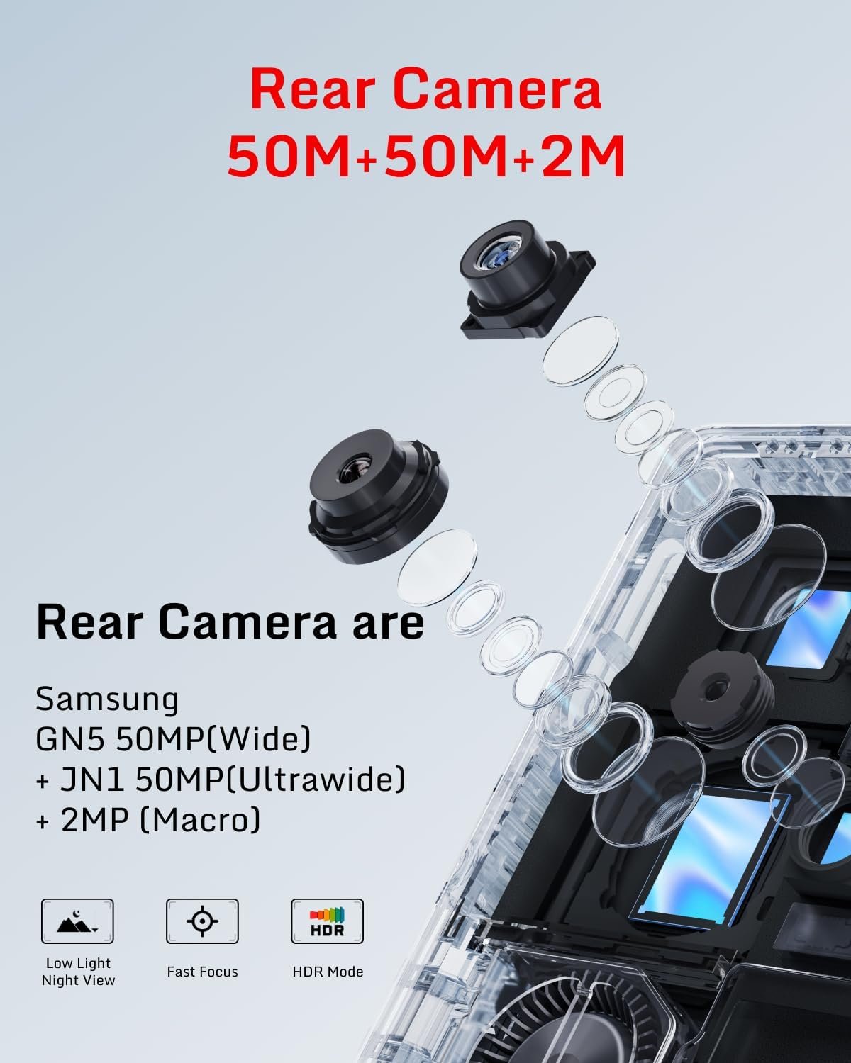 The rear cameras are GN5 50MP (wide) + 50MP (super wide) + 2MP (macro). The main camera has been upgraded.